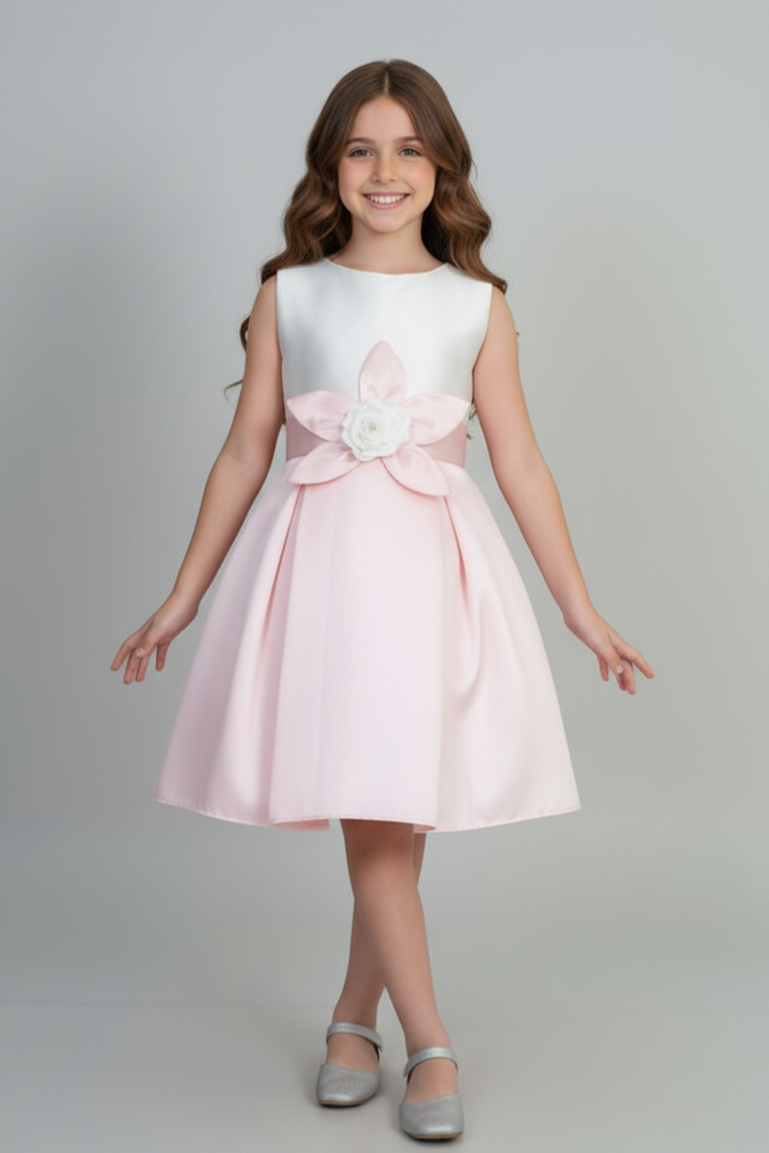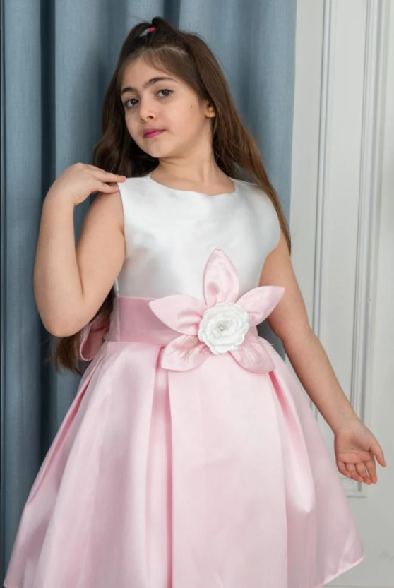 🌸 فستان بناتي سهرات مميز بتصميم أنيق لعمر 2 - 12 سنة 🌸 دلّلي صغيرتك بإطلالة ساحرة مع هذا الفستان البناتي الرائع، المصمم خصيصًا ليكون الخيار المثالي لمناسبات السهرات والحفلات! يأتي الفستان بقصة كت بدون أكمام ليمنح طفلتك حرية الحركة وأناقة لا مثيل لها. يتميز بتصميم فريد، حيث يأتي الجزء العلوي باللون الأبيض الناعم، وينسدل من بعد الخصر بلون زهري جذاب، مع لمسة أنثوية راقية من خلال الوردة الزهرية البارزة على الخصر.