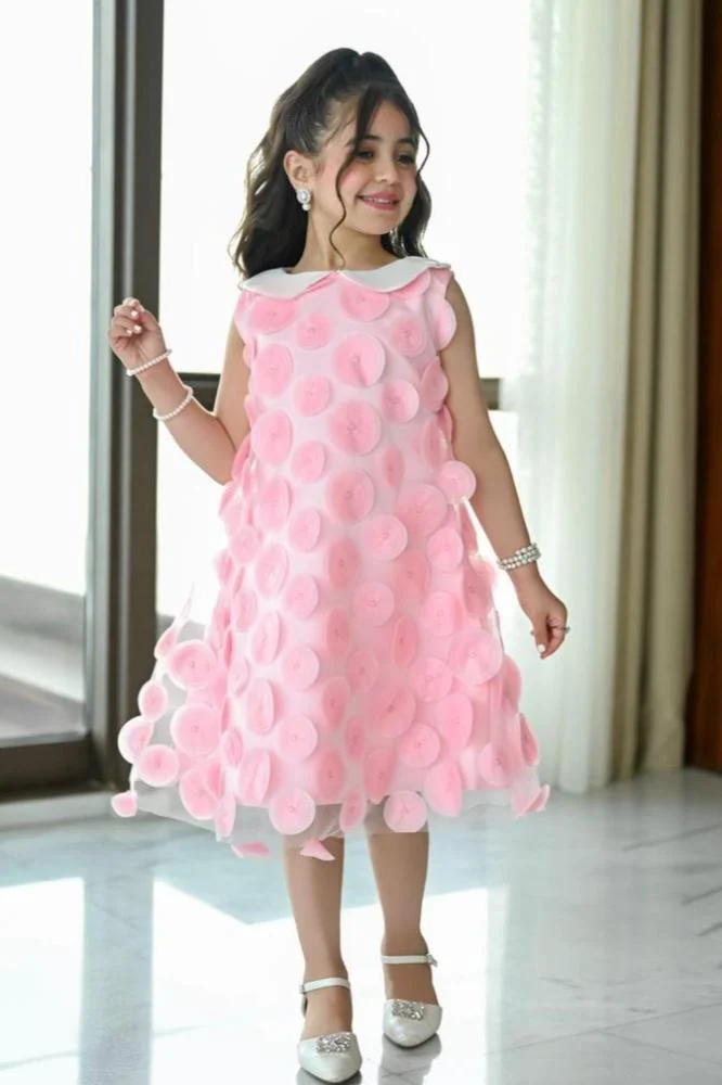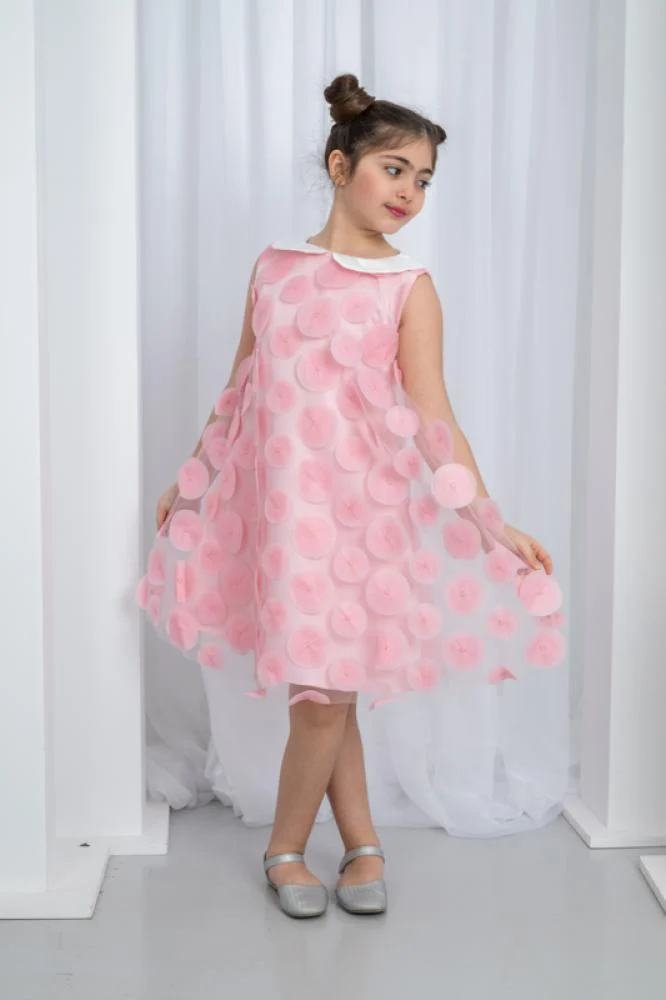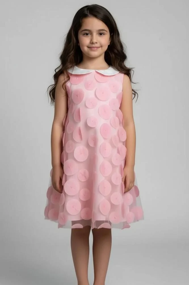 🎀 فستان سهرات بناتي زهري مميز بلمسة ناعمة لعمر 2 - 12 سنة 🎀 أضيفي لمسة من المرح والرقي لإطلالة صغيرتك مع هذا الفستان البناتي الرائع باللون الزهري الجذاب! يتميز الفستان بقصة كت عصرية مع تفاصيل دائرية بارزة تغطي التصميم بالكامل، مما يمنحه طابعاً أنيقاً ومرحاً في آن واحد.