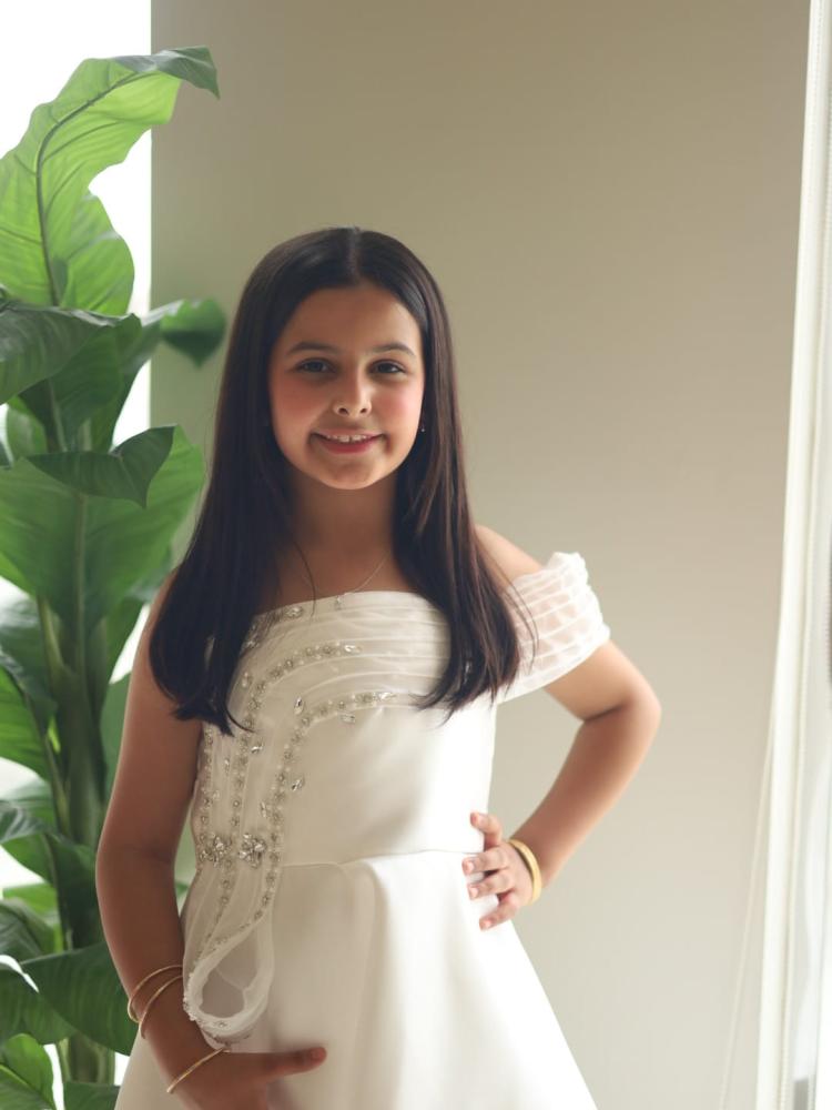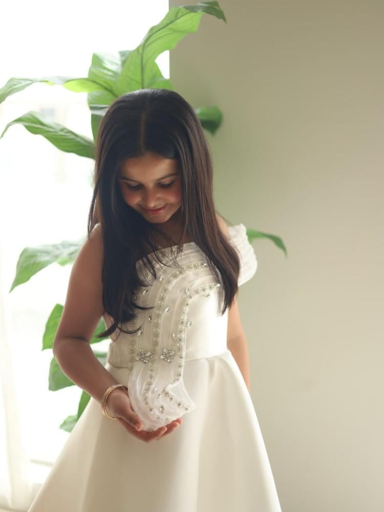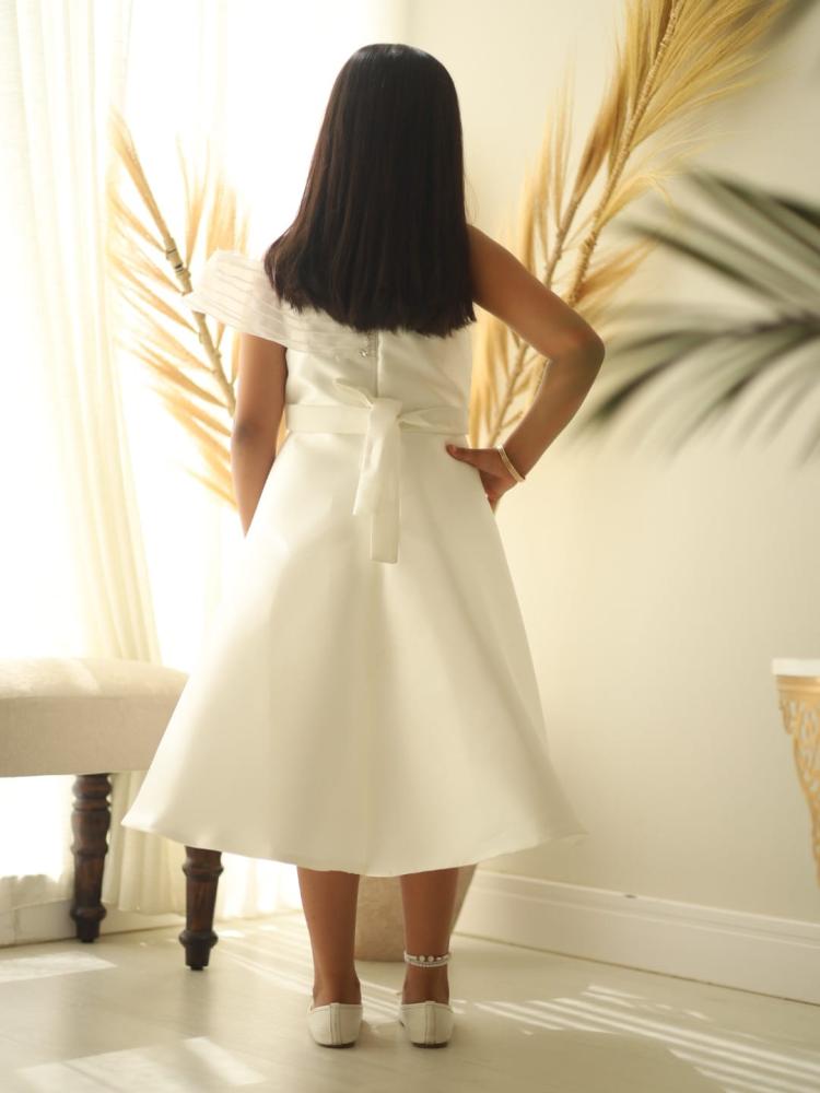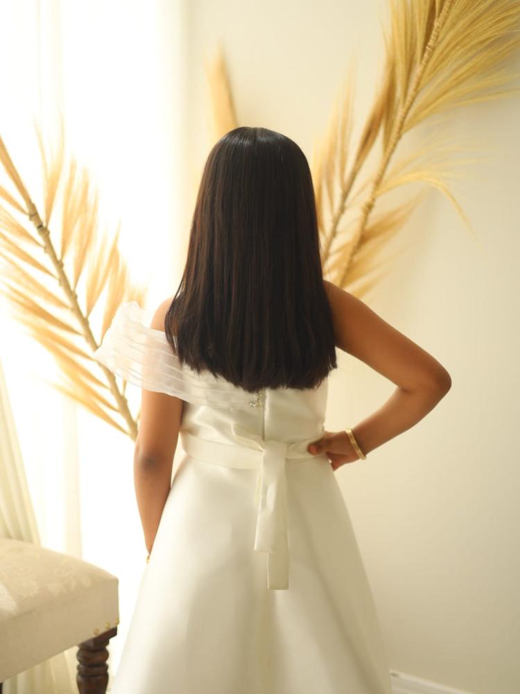 فستان سهرة أبيض مع قصة جانبية أنيقه على الصدر