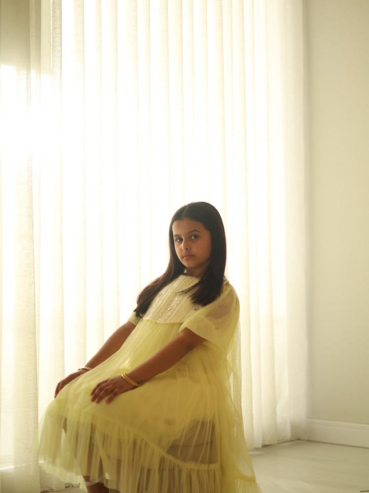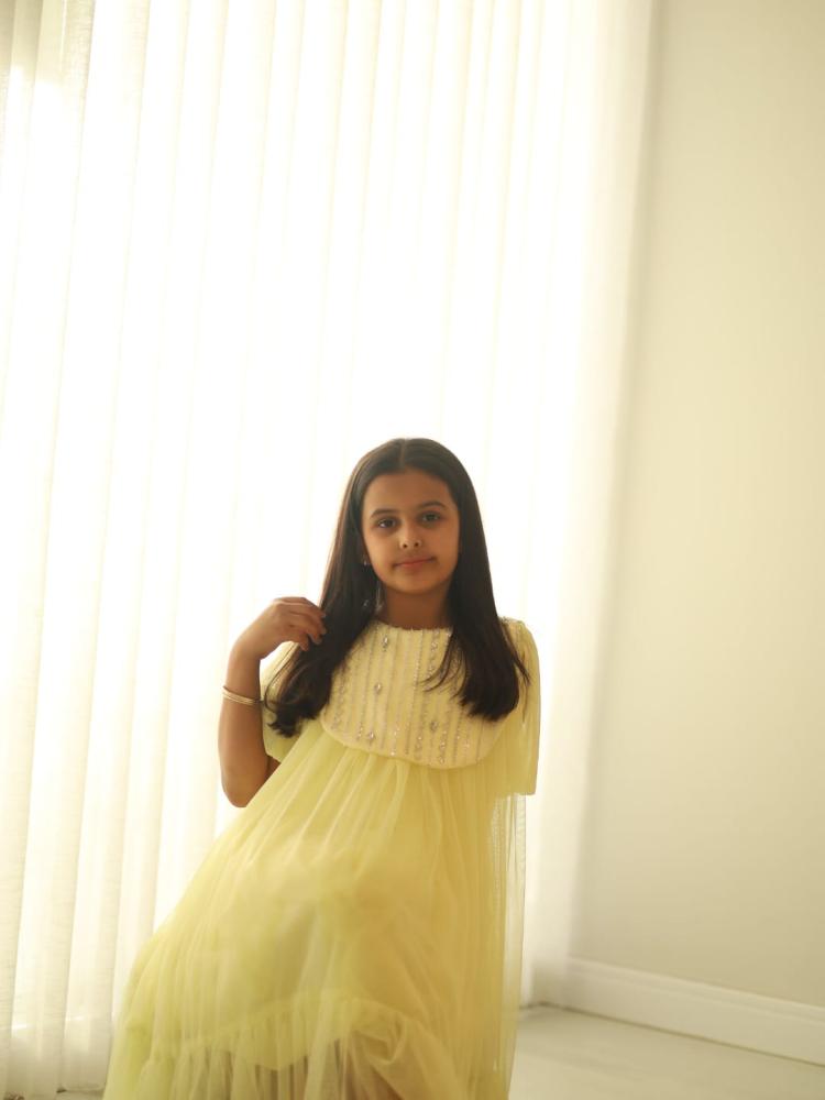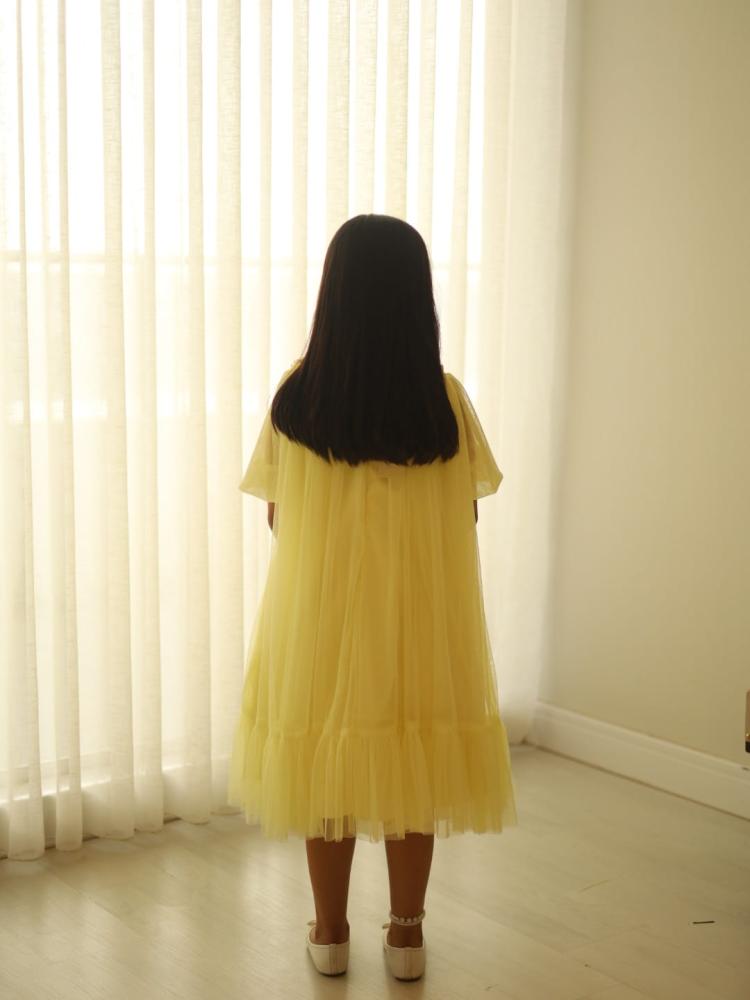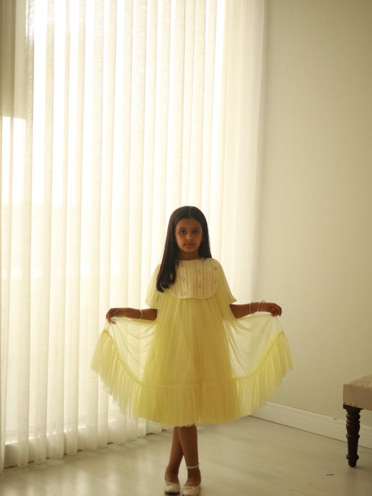 فستان سهرة أصفر أنيق مزين بالؤلؤ على الصدر