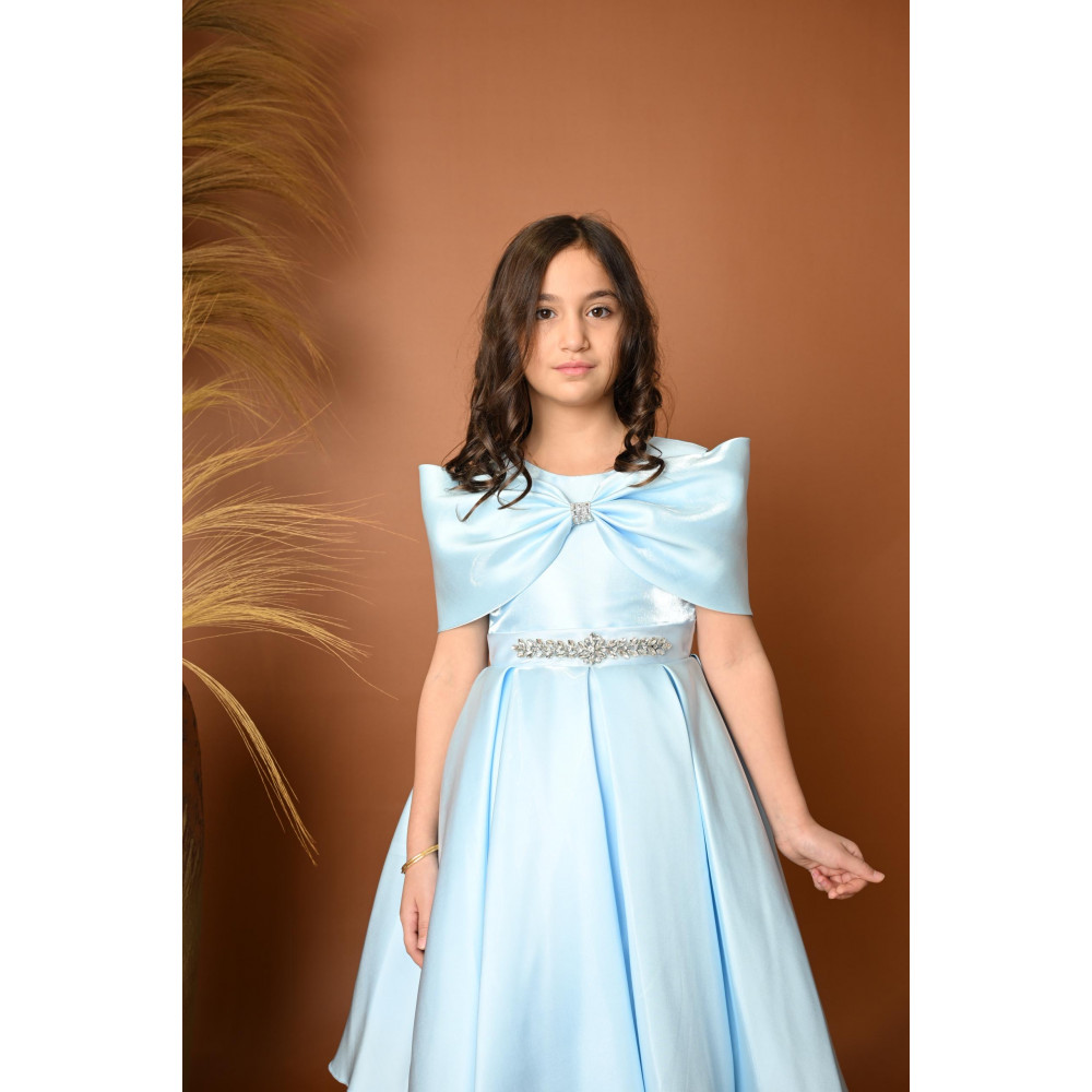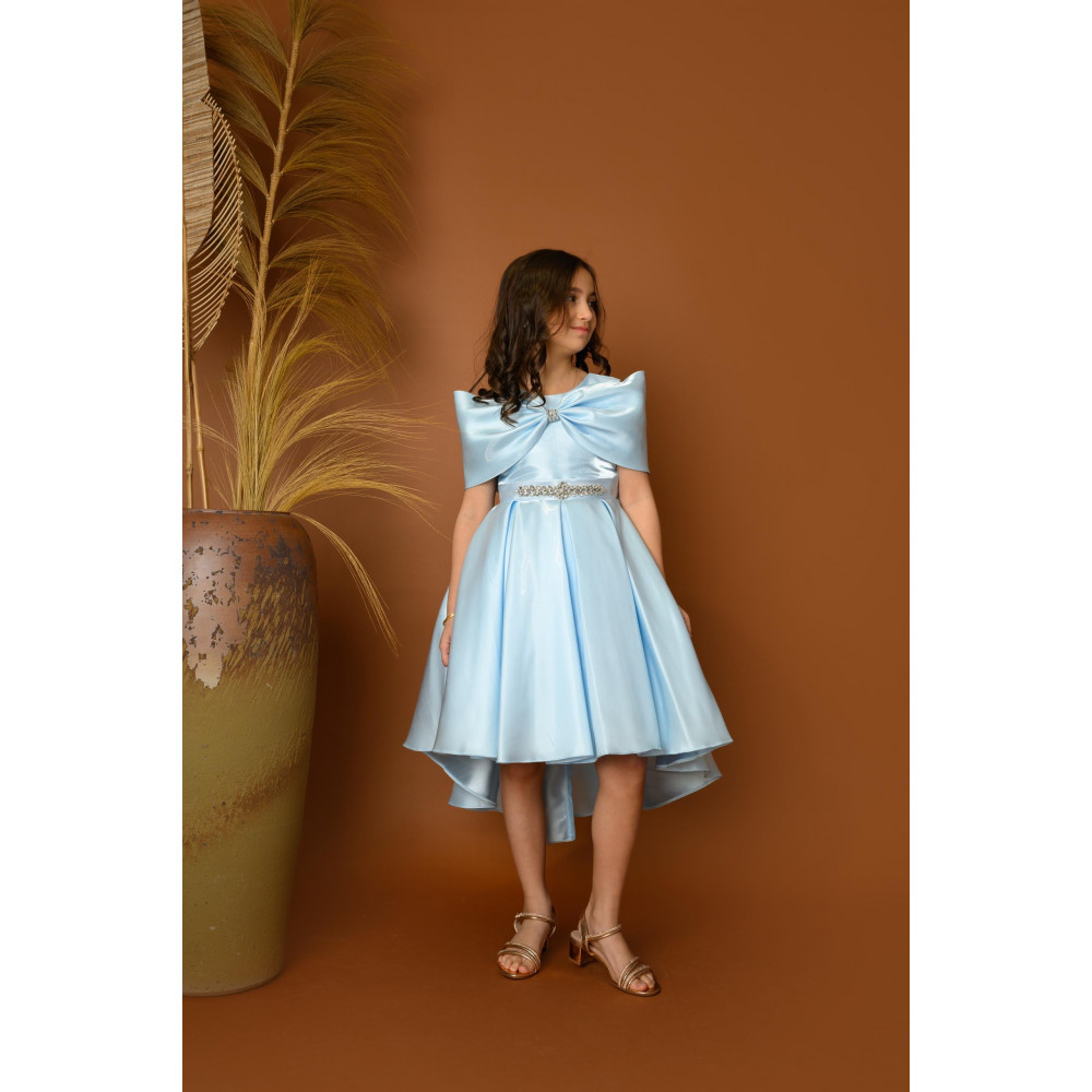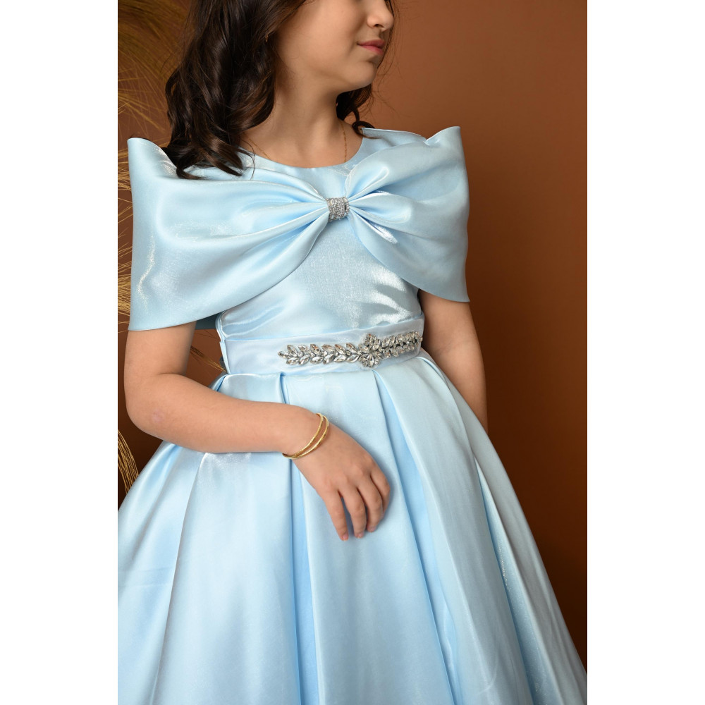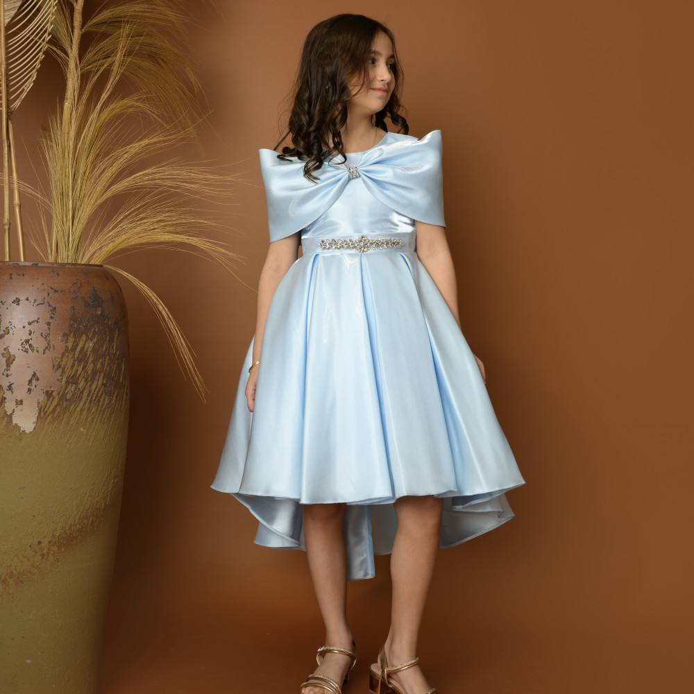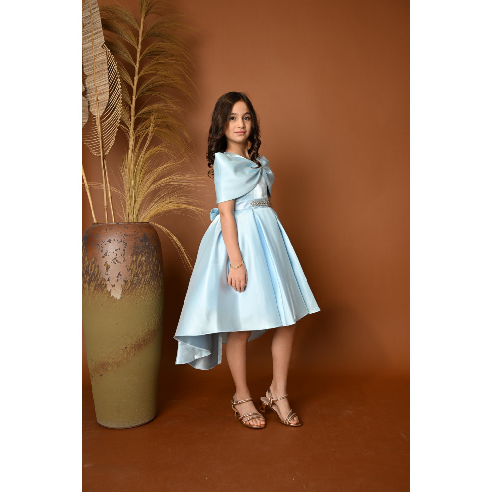 أضيفي لمسة من الأناقة لإطلالة طفلتك مع هذا الفستان الفاخر من ماركة ميدي كيدز Midikids. يتميز بلونه الأزرق السماوي الجذاب وتصميمه الفريد الذي يتضمن فيونكة كبيرة تزين الكتف وحزام مرصع بالكريستال لإضافة لمسة من الفخامة. القصة العصرية غير المتساوية تمنح الفستان جاذبية خاصة، مما يجعله مثالياً للمناسبات الراقية مثل حفلات الزفاف والأعياد. مصنوع من خامات عالية الجودة لضمان الراحة والجمال. اختاري ميدي كيدز Midikids لتألق طفلتك في كل مناسبة