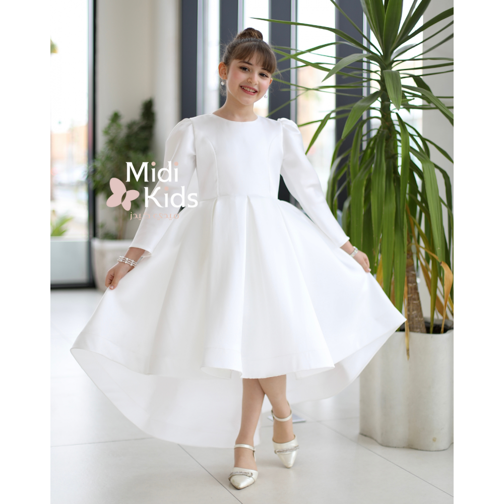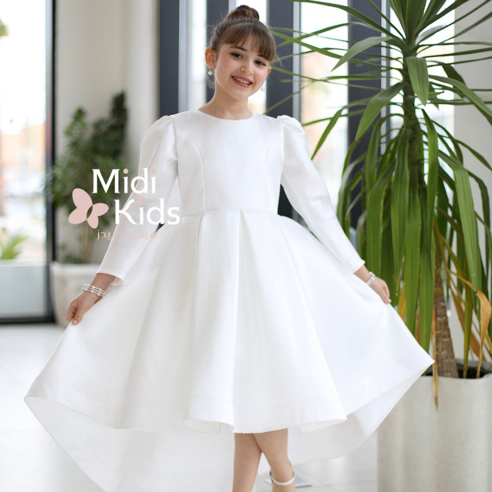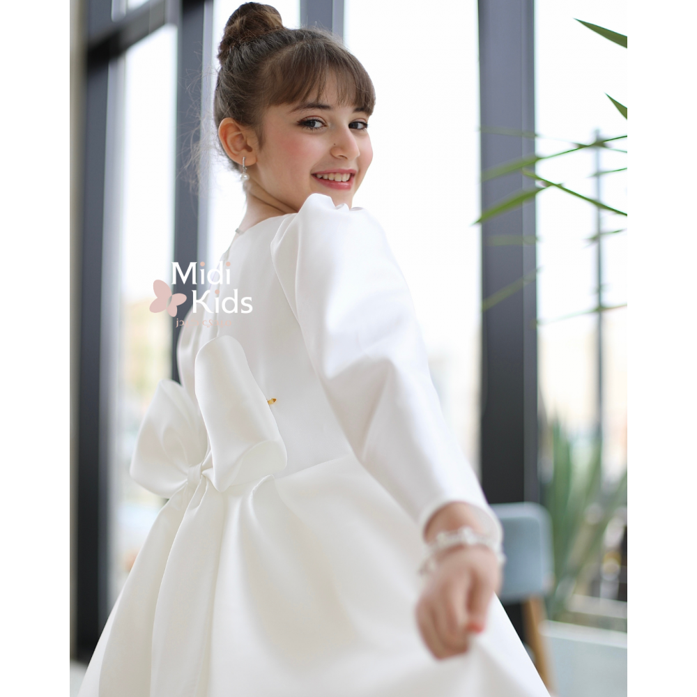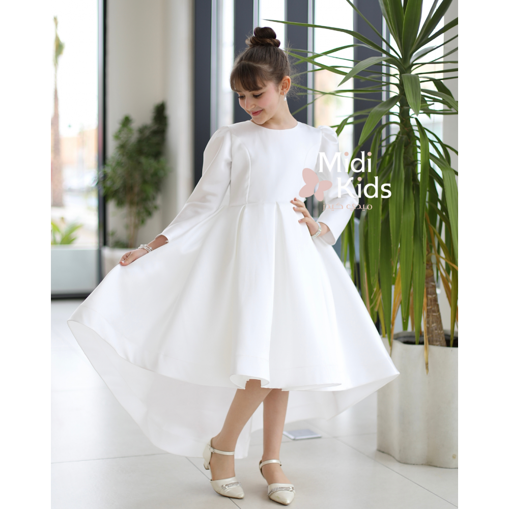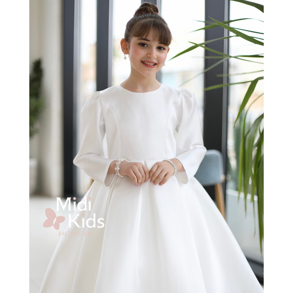 فخامة الميكادو.. حينما يتحدث القماش عن الرقيللمناسبات التي تتطلب حضوراً استثنائياً، نقدم لكِ هذا الفستان المصمم من قماش الميكادو (Mikado) الفاخر. يتميز هذا القماش بقوامه المتماسك ولمعته اللؤلؤية الهادئة التي تعكس الضوء بذكاء، مما يمنح الفستان هيكلاً ملكياً ثابتاً لا يضاهى. ومن الخلف، تكتمل الحكاية بفيونكة كبيرة تضفي لمسة درامية ساحرة، لتكون طفلتك محط الأنظار من لحظة دخولها وحتى مغادرتها. لماذا تختارين قماش الميكادو لطفلتك؟لأنه الخامة المفضلة لدى المصممين العالميين لفساتين السهرة الراقية:هيبة القماش (Mikado Fabric): قماش ذو نسيج ثقيل ومتماسك يحافظ على "نفشة" الفستان وشكله الهندسي الرائع دون الحاجة لكثرة الطبقات، ويمنحه مظهراً غنياً وباهظ الثمن.الفيونكة الخلفية (Statement Back Bow): تتوج ظهر الفستان فيونكة كبيرة ومتقنة الصنع من نفس الخامة، لتكون العلامة الفارقة في التصميم وتضيف لمسة أنثوية طاغية.قصة ملكية واسعة: بفضل قوام القماش، تنسدل التنورة بقصة واسعة وثابتة (Ball Gown / A-Line)، مما يمنح طفلتك شعور الأميرات الحقيقي عند الحركة والدوران.أناقة المينيماليزم (Minimalist Elegance): يعتمد جمال هذا الفستان على فخامة الخامة ونظافة القصات، بعيداً عن التكلف، مما يجعله قطعة كلاسيكية لا تبطل موضتها أبداً.مثالي للأفراح: هو الخيار رقم واحد لمرافقات العروس (Flower Girls) وحفلات الزفاف الكبرى.جودة وتفاصيل لا تُنسىتصميم يجمع بين الجمال والراحة؛ فالبطانة الداخلية ناعمة تماماً على البشرة، والسحاب مخفي لضمان مظهر انسيابي نظيف من الخلف. امنحيها إطلالة لا تتكرر!استثمري في قطعة فنية تبرز جمالها في أهم المناسبات.✨ اطلبيه الآن.. فالأناقة الحقيقية تبدأ من اختيار الخامة! ✨