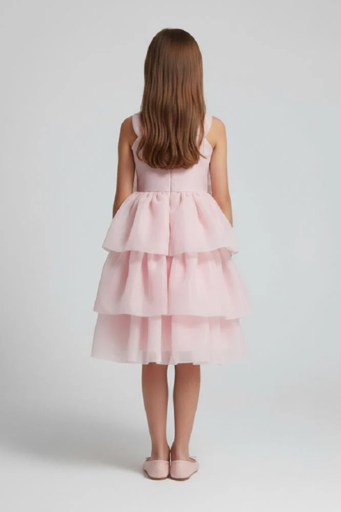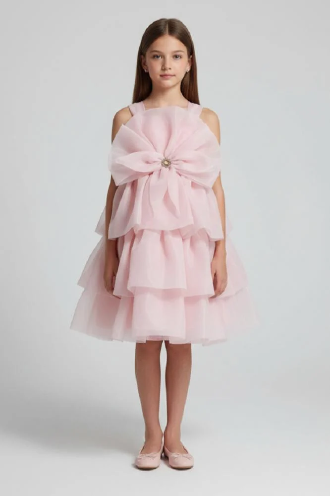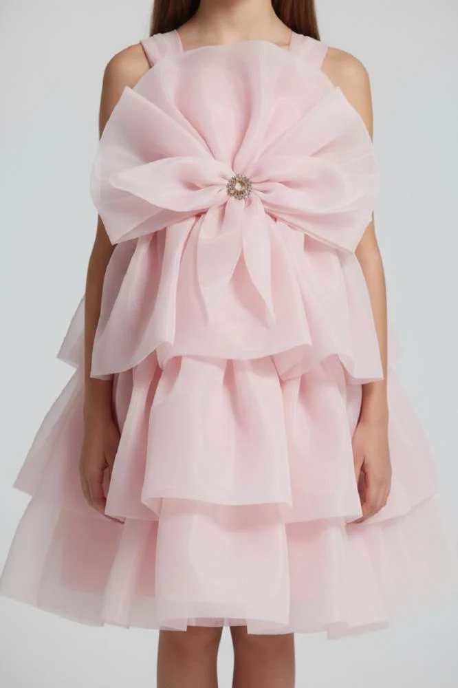 اجعلي طفلتك نجمة الحفل مع فستان السهرة الأكثر سحراً لهذا الموسم. يتميز هذا التصميم بطبقات الأورجانزا المتدرجة التي تمنح الفستان مظهراً "منفوشاً" وحالماً، مع لمسة فاخرة تتمثل في فيونكة ضخمة تزين الصدر ويتوسطها بروش من الكريستال اللامع. إنه الخيار المثالي لحفلات الزفاف، الأعياد، وجميع المناسبات التي تتطلب إطلالة ملكية لا تُنسى.