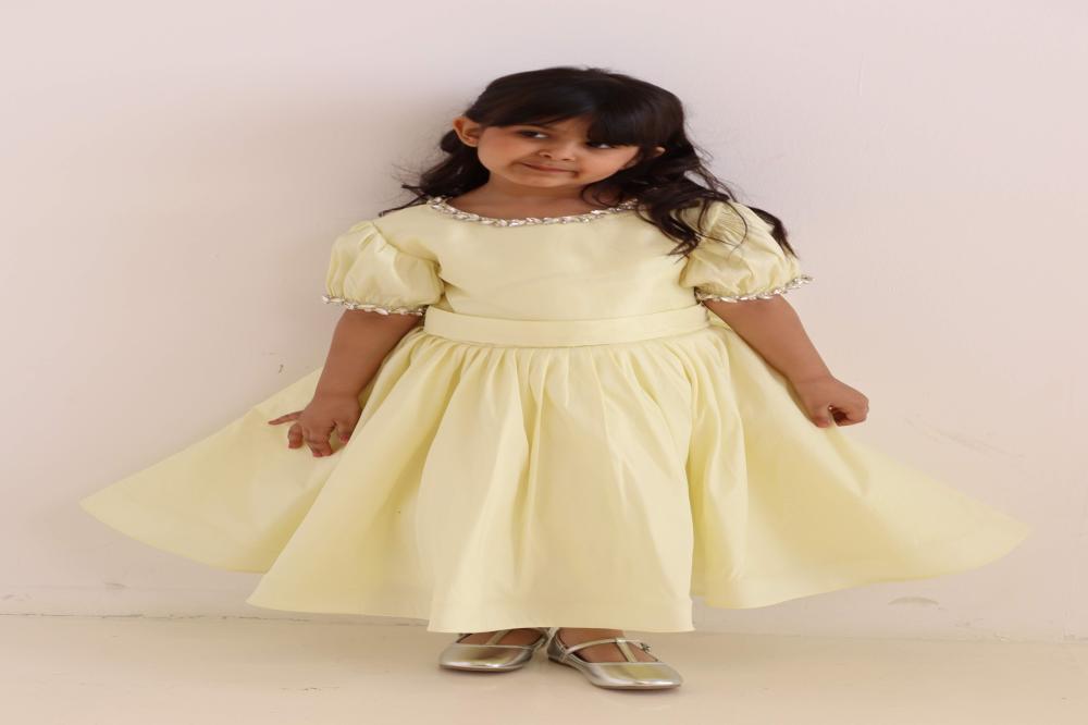 فستان سهرة ليموني نفاش مع فينكه كبيره في الظهر