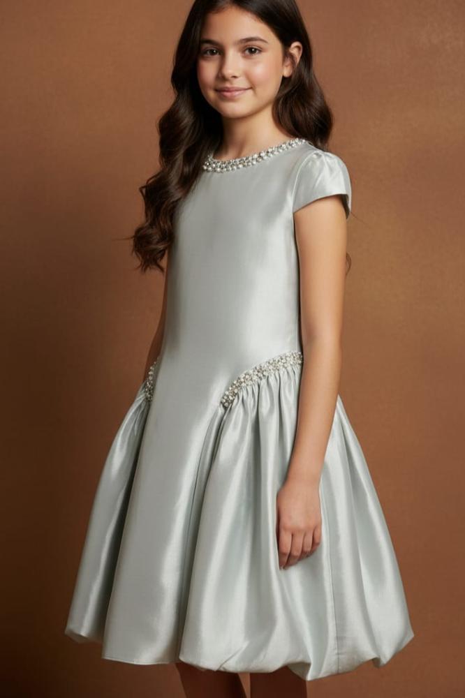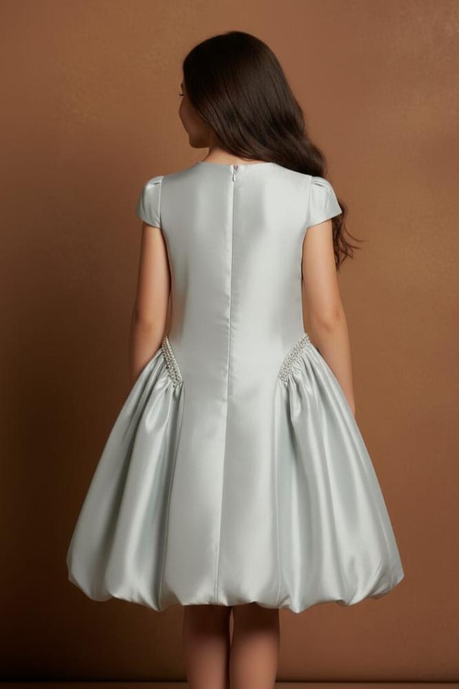 فستان فضي ثلجي حرير مرصع بالؤلؤ