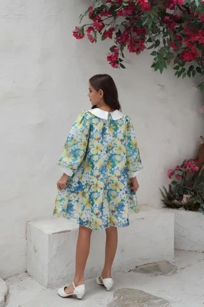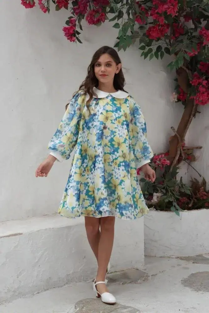 فستان مورد باللوان متعددة العيسائي للاطفال فستان ساحر من تصميم العيسائي للأطفال، يتميز بتصميمه الكلاسيكي مع ياقة بيضاء دائرية وأكمام طويلة تضفي لمسة من البراءة والرقي. يحتوي الفستان على نقشة زهرية متألقة بألوان نابضة بالحياة، مما يجعله خياراً مثالياً للمناسبات المميزة مثل الأعياد والحفلات.