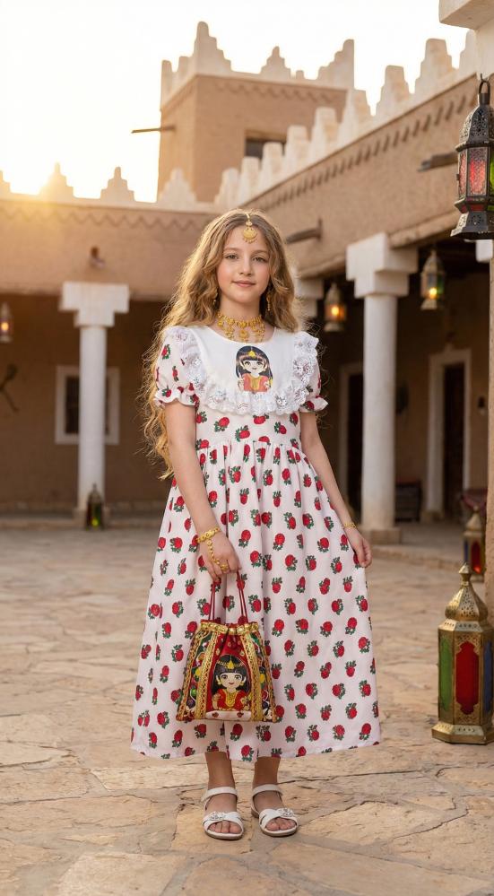 تصميم ساحر يجسد عبق الماضي بروح معاصرة، يتميز الفستان بلونه الأبيض الناصع المزين بنقوش الورود الحمراء المبهجة. تزدان منطقة الصدر بياقة الدانتيل الفاخرة التي تتوسطها رسمة فنية لشخصية شعبية بالزي التقليدي، مما يجعله القطعة المثالية للمناسبات الوطنية والاحتفالات التراثية
