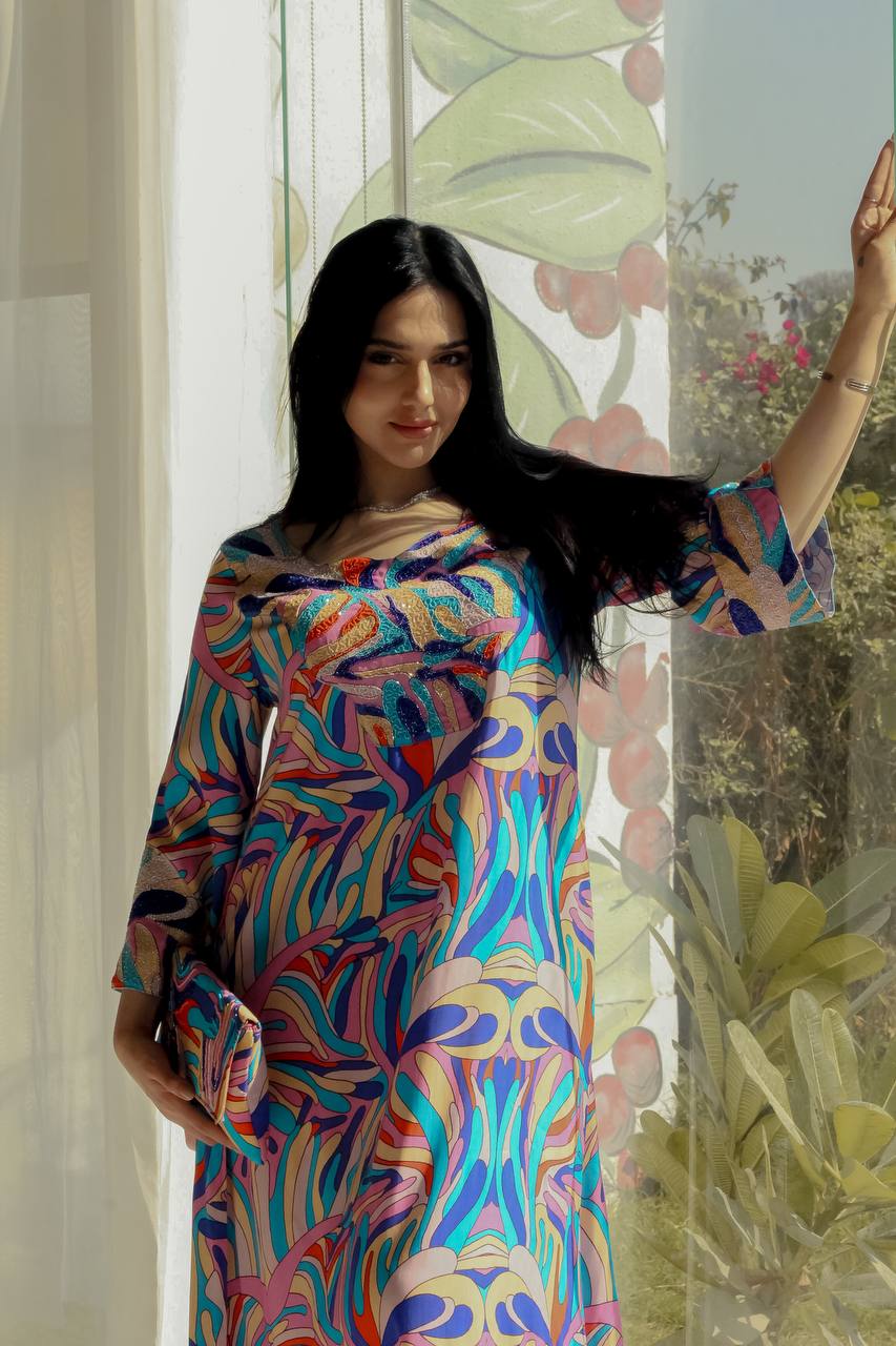 وردي مع شك مميز على الرقبة و الاكمام القماش رايون مع قطن الغسيل يدوي او بخار للحفاض على الشك لا ينكمش بعد الغسل المقاسات =\ m \ L \s الطول واحد لجميع المقاسات = 140 سم مقاس الصدر سمول ( S ) = 50 سم مديم ( M )=53 سم لارج ( L ) = 57 سم ملاحظات يوجد باوتش مميز مطابق يطلب بشكل مستقل
