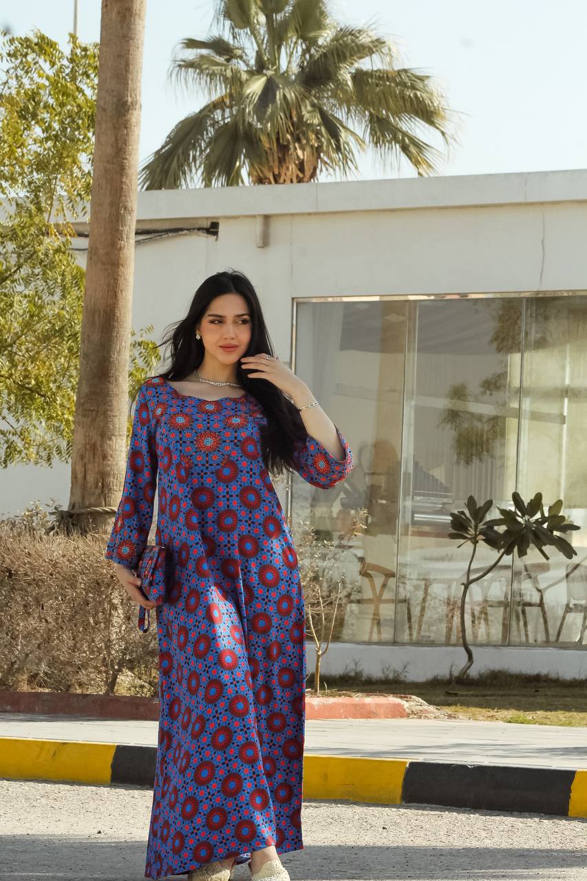 ازرق مع شك مميز على الرقبة و الاكمام القماش رايون مع قطن الغسيل يدوي او بخار للحفاض على الشك لا ينكمش بعد الغسل المقاسات =\ m \ L \s الطول واحد لجميع المقاسات = 140 سم مقاس الصدر سمول ( S ) = 50 سم مديم ( M )=53 سم لارج ( L ) = 57 سم ملاحظات يوجد باوتش مميز مطابق يطلب بشكل مستقل