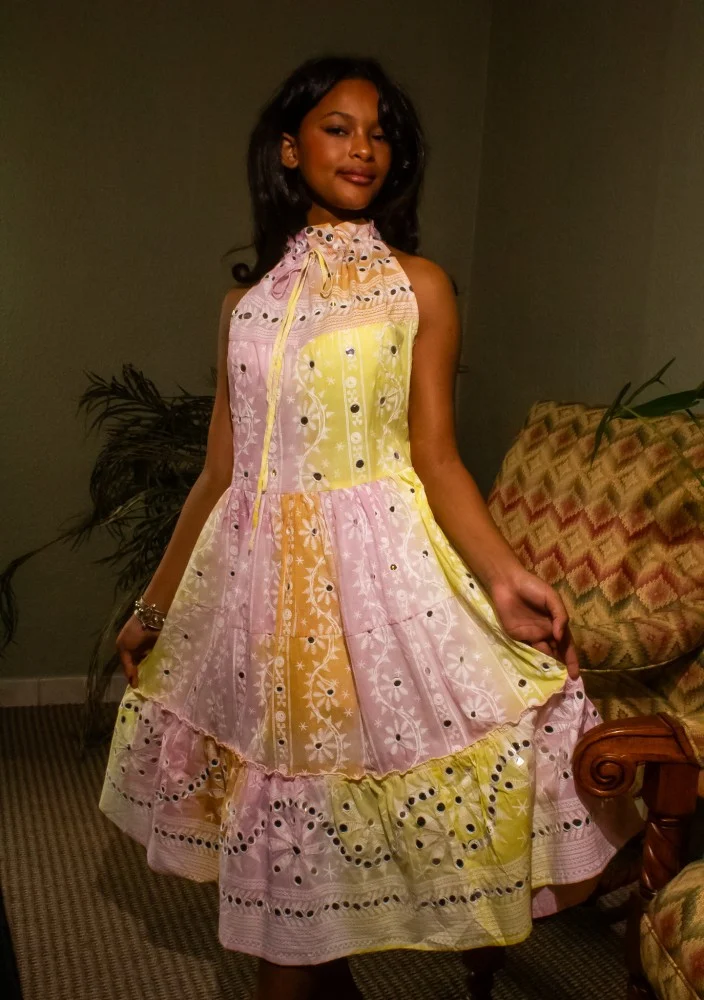 تحفة فنية بكل معنى الكلمة، هذا الفستان المصنوع من قطن ناعم ومطرز يدويًا بخياطة رائعة على شكل ورود ومزخرف بالمرآيا اللامعة التي تضفي لمسة من الأناقة والفخامة