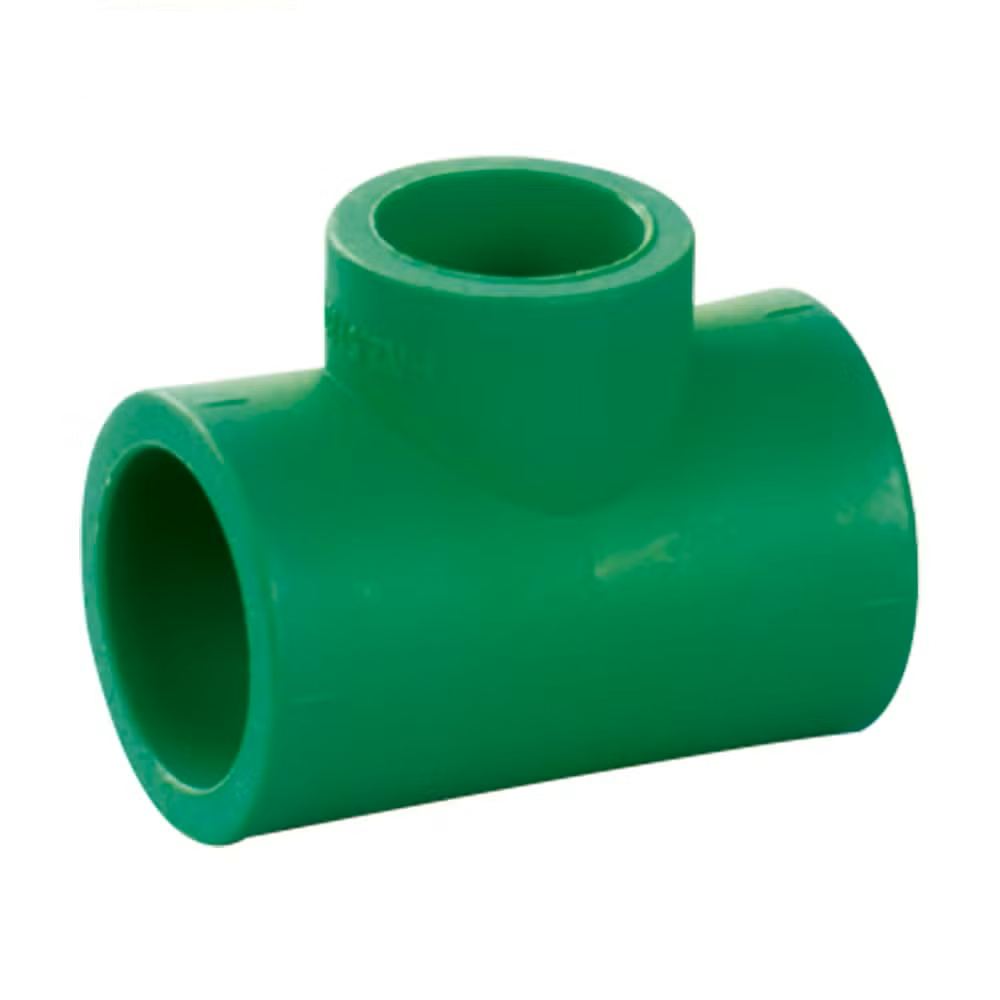وصلة تي حرارية من PPR أخضر ضغط 20 بار لتفرع خطوط المياه في أنظمة السباكة والتدفئة.