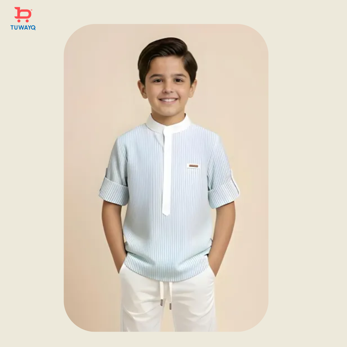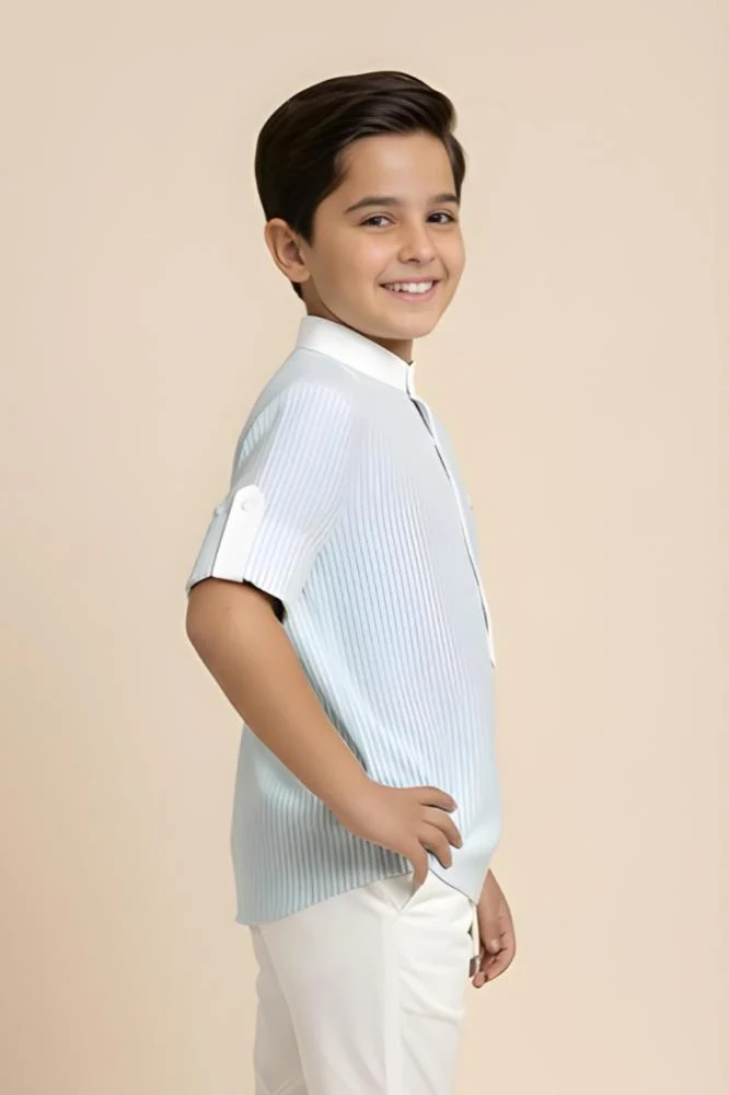 أضف لمسة من التميز والرقي إلى إطلالة صغيرك مع هذا القميص السماوي العصري للأولاد، الذي يجمع بين البساطة والفخامة في آنٍ واحد.