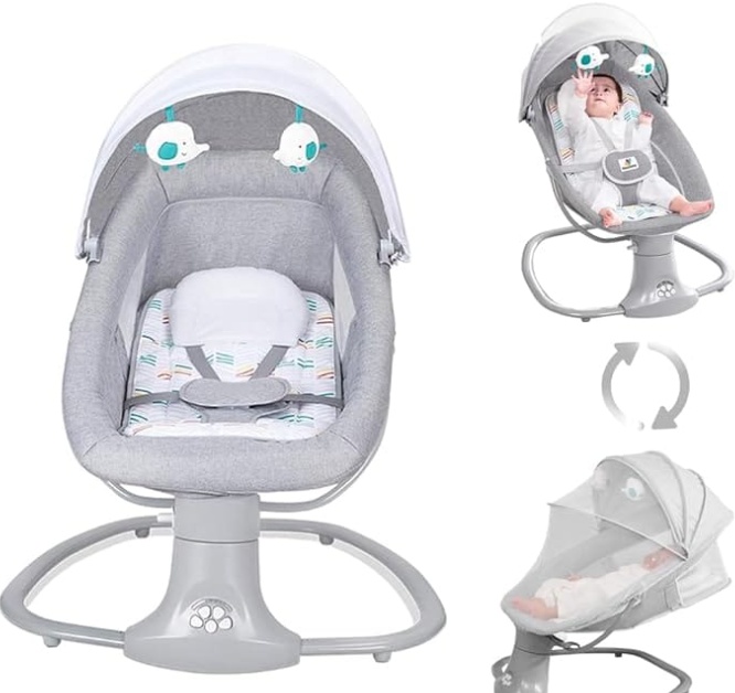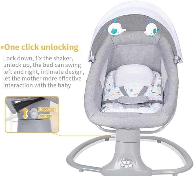 امنح طفلك الراحة والهدوء مع هذا الكرسي الهزاز الكهربائي المصمم خصيصًا لراحة الرضع.; يتميز بتصميم مريح وآمن مع حزام تثبيت، ومظلة شفافة للحماية من الإضاءة، إضافةً إلى لعبتين معلقتين لتحفيز الطفل وتنمية مهاراته البصرية.; ولادي