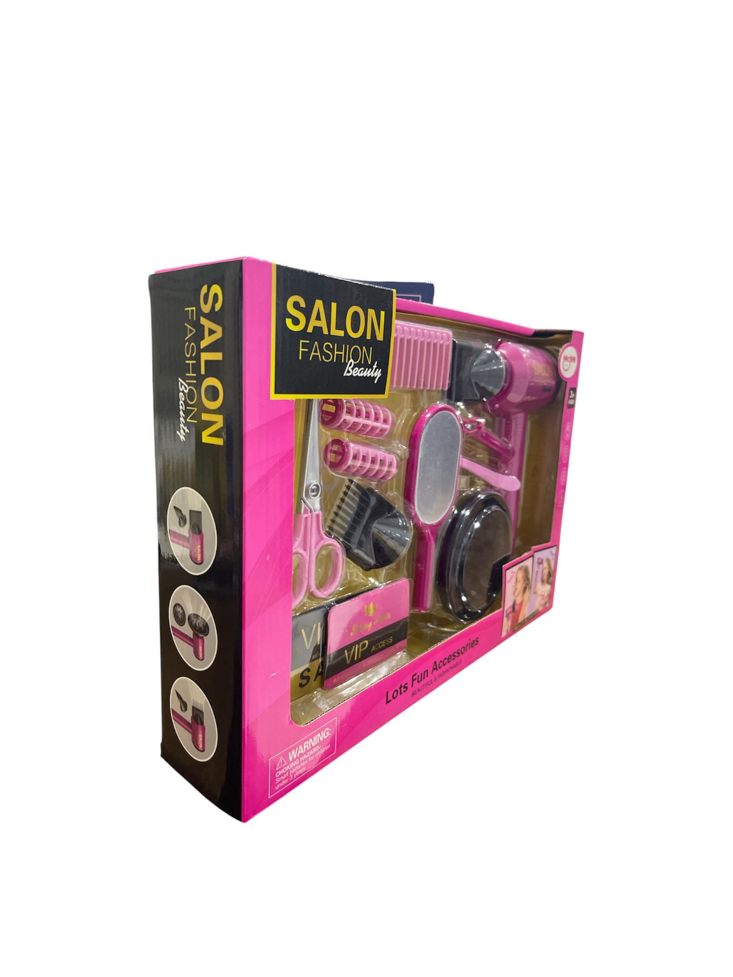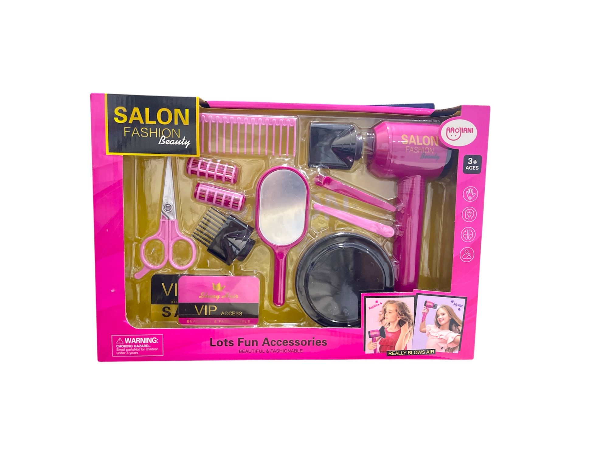 تشمل المجموعة مجفف شعر لعبة، ومشط، ومقص، ومرآة، وبكرات شعر، وإكسسوارات أخرى لمحاكاة تجربة صالون التجميل.
