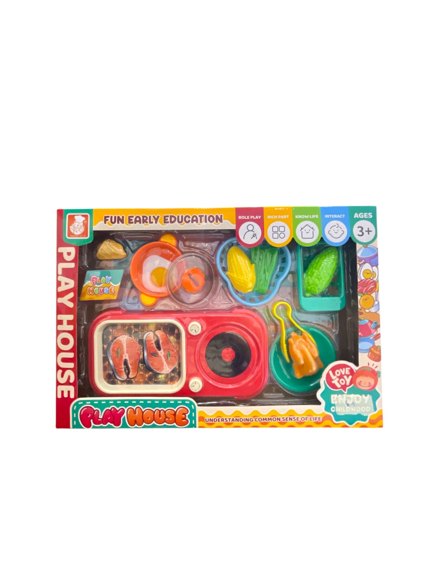 • المكونات: تتضمن شواية، أدوات طهي، وقطع طعام بلاستيكية مثل السمك، الذرة، الخيار، والبيض المقلي.