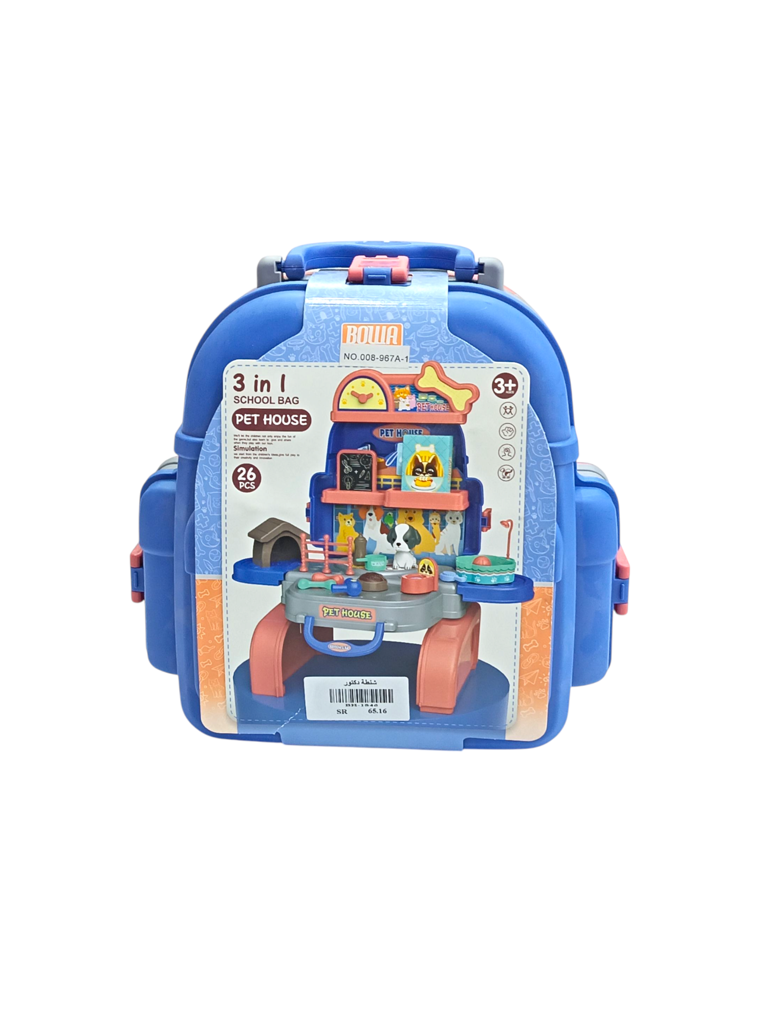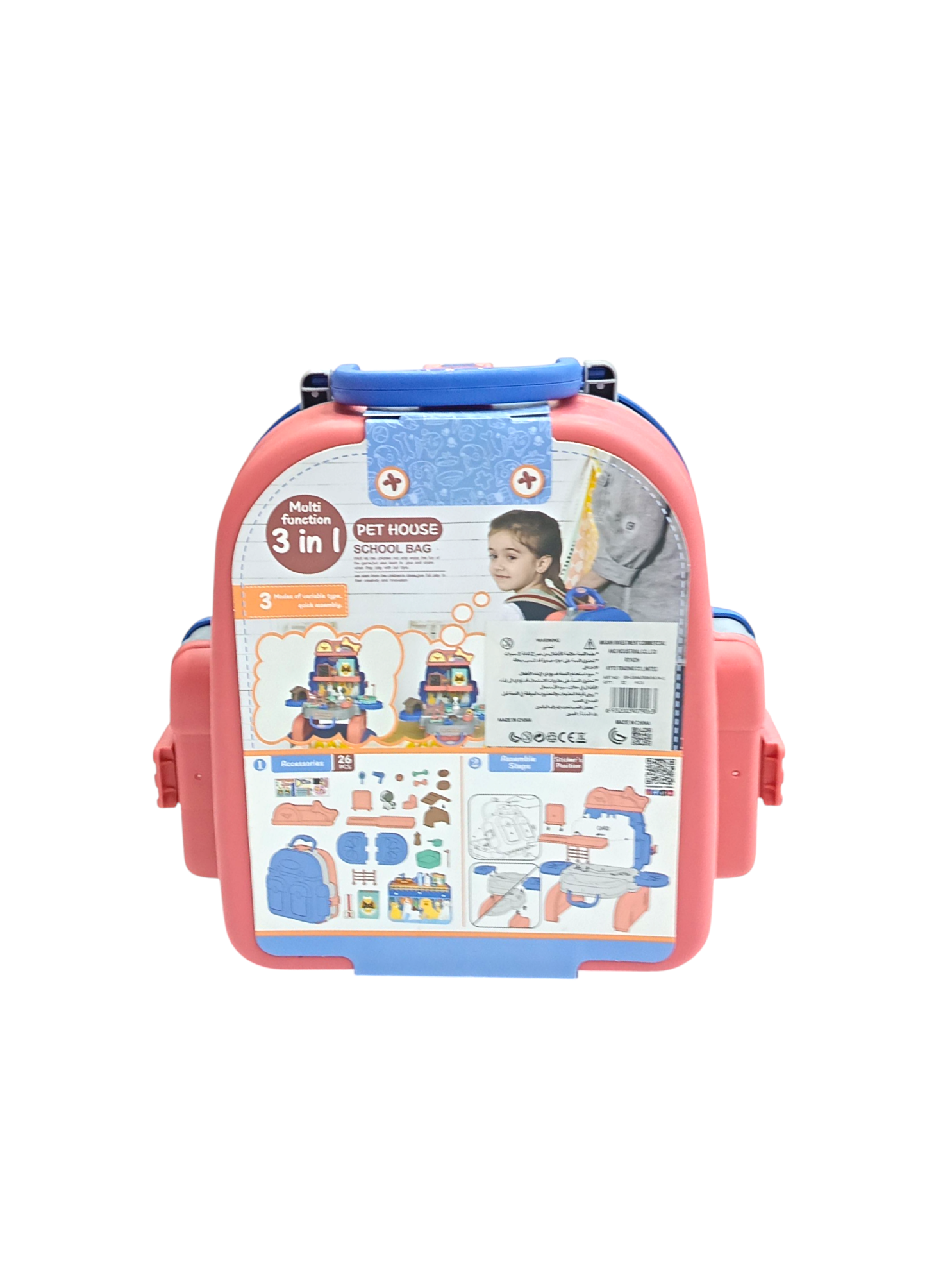 مجموعة لعب على شكل حقيبة مدرسية قابلة للتحويل إلى "بيت حيوانات أليفة" أو مركز رعاية للحيوانات الأليفة