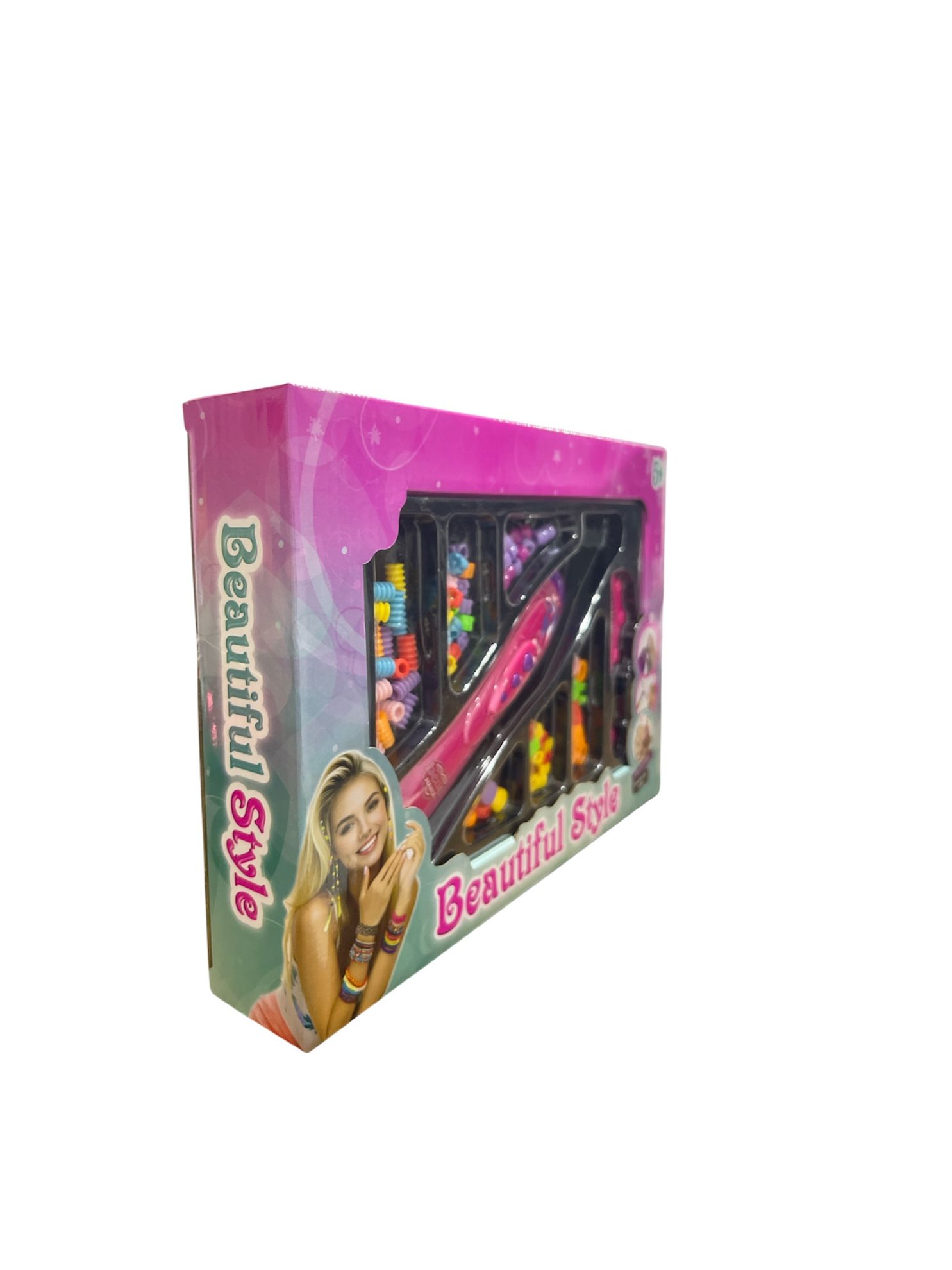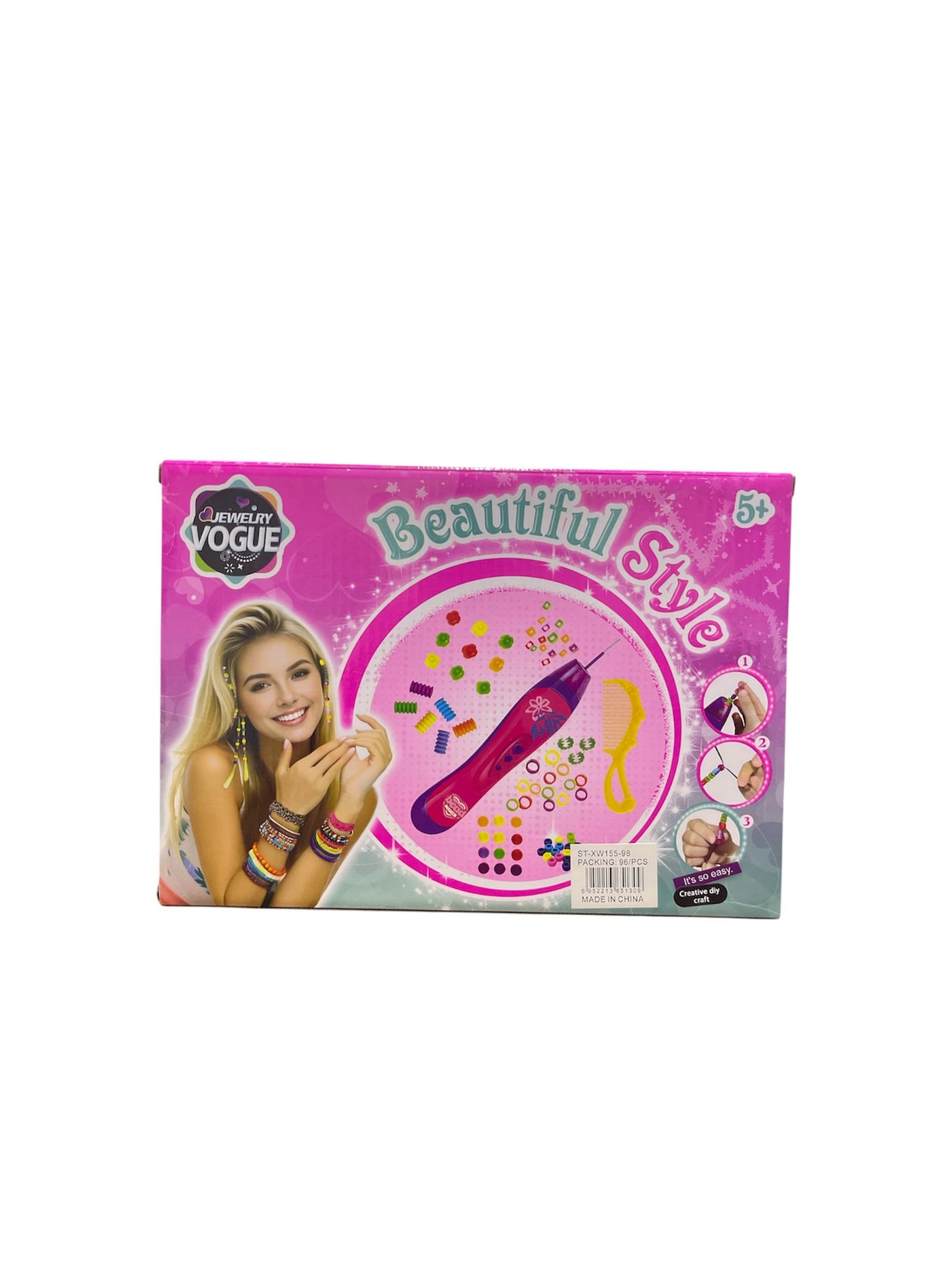 مجموعة "Beautiful Style" لتصفيف الشعر وتزيينه، وهي مخصصة للأطفال بعمر 5 سنوات فما فوق. تحتوي المجموعة على الأدوات والإكسسوارات التالية:   أداة تضفير الشعر: أداة باللون الوردي مصممة للمساعدة في تضفير الشعر بسهولة. خرز ملون