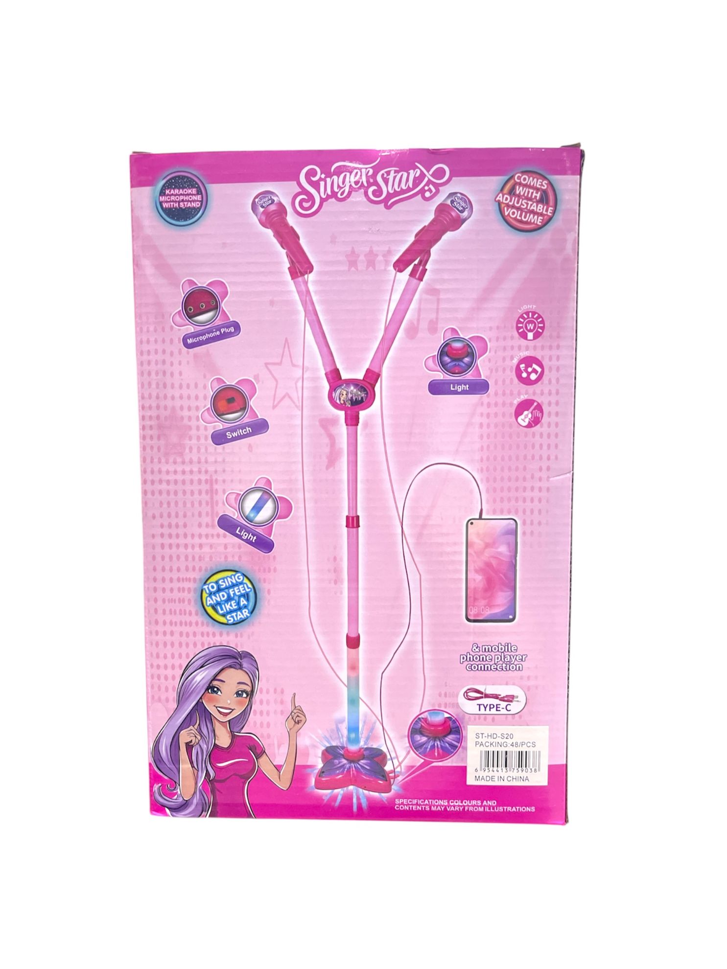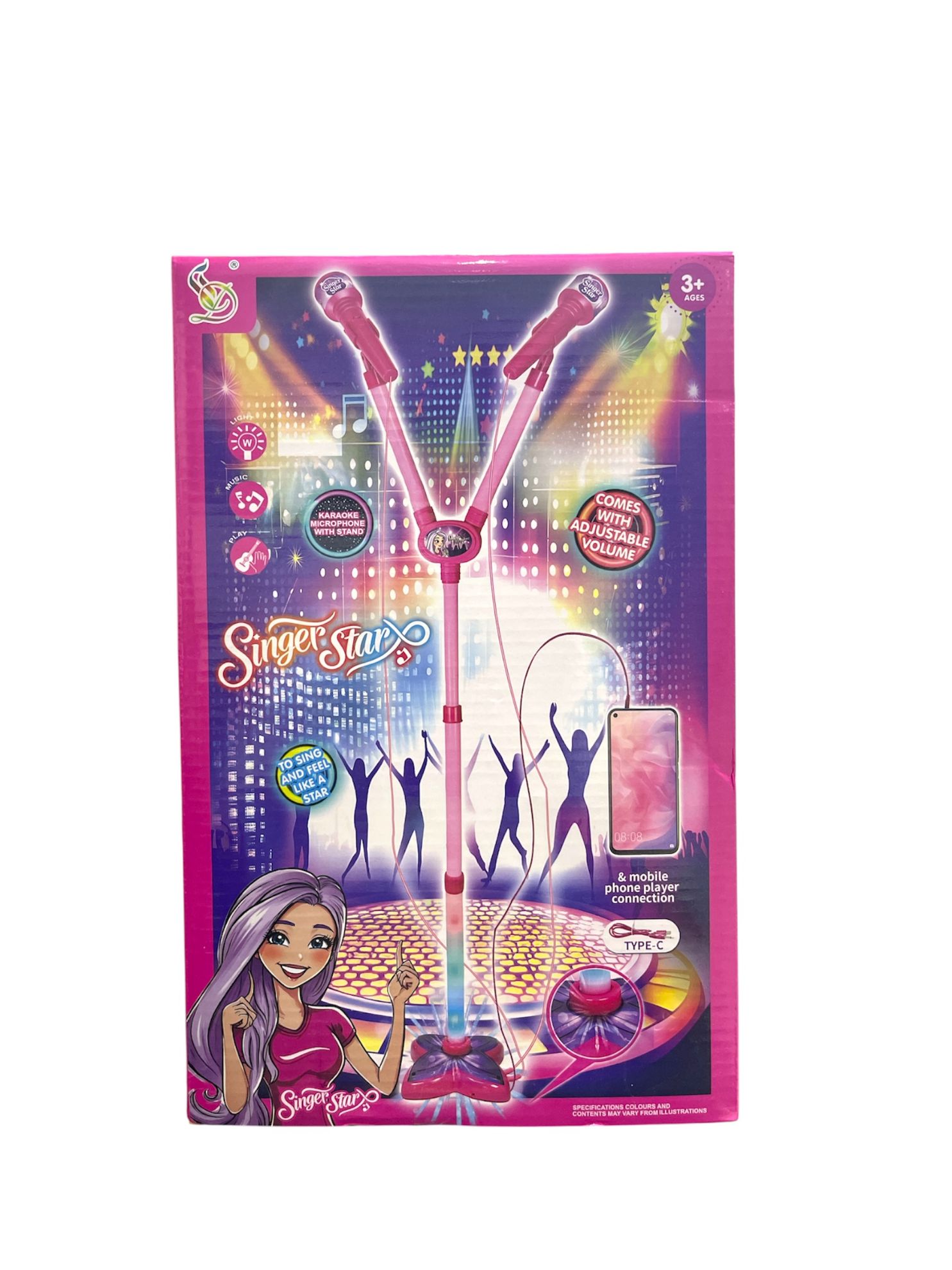 ميكروفون كاريوكي "Singer Star" وردي اللون مع حامل مزدوج، ومصمم للأطفال بعمر 3 سنوات فما فوق.