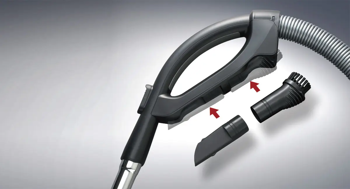 يوفر المـقبض سيفي الشكل الذي يتميز بالتصميم المريح مع فرشاة الغبار وفوهـة التجاويف سهولة الاستدارة في شتى الاتجاهات.