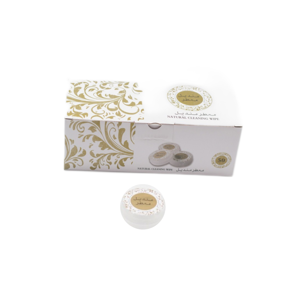 وصف المنتج: "ما هو منديلي؟منديلي هو منديل طبيعي معطر ومدمج قابل للتحلل، داخل علبة قيها 50حبة قطر الحبة 5سم، قابلة لإعادة التدوير، وتحتوي في داخلها على سائل نقي، خالٍ من الإضافات، وذو رائحة عطرية خاصة.يحفظ المنديل جافاً داخل علبته حتى يتم الضغط بالإصبع على مركز العلبة من الأعلى، حينها يمتص المنديل الجاف السائل العطري، ليكون المنديل بعدها جاهزاً للاستخدام.