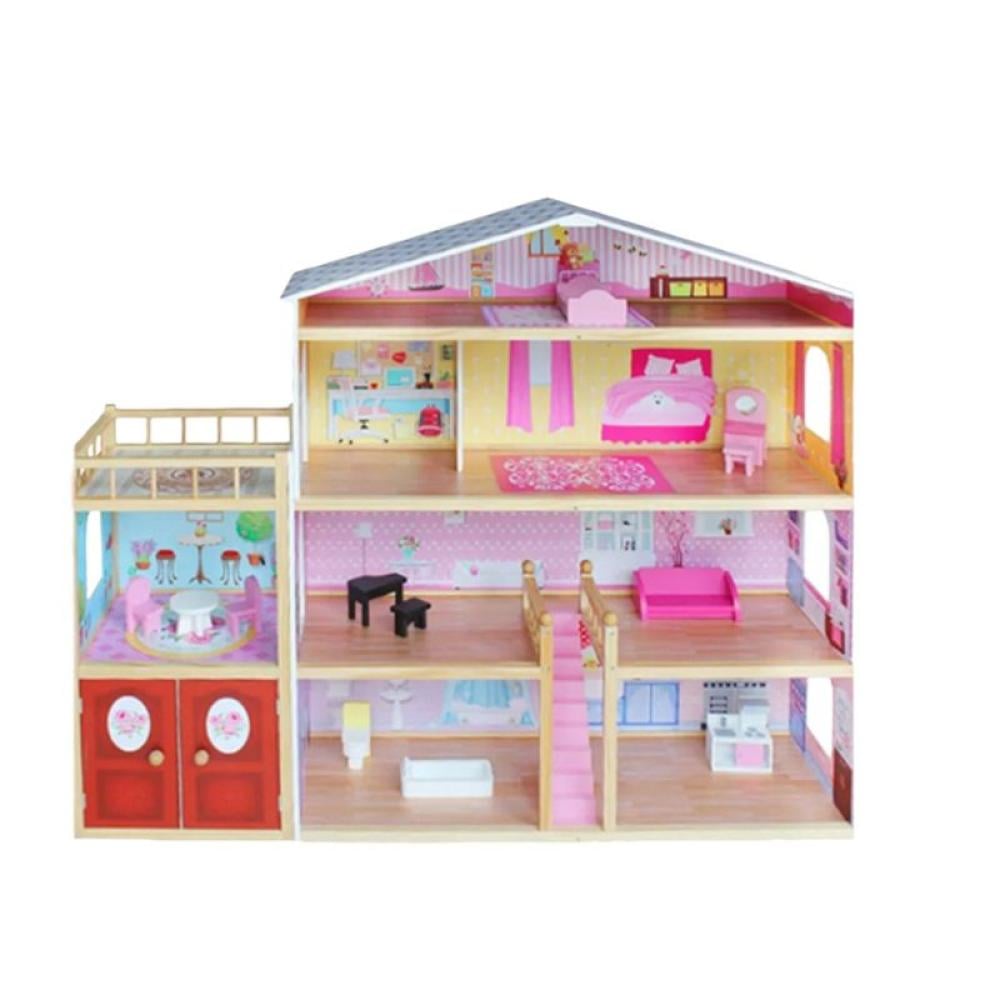 منزل دمى خشبي مع أثاث كامل للأطفال