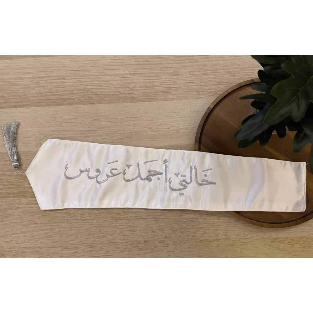 طول القطعة : 22.5 انش | 57 سمعبّري عن مشاعرك بلمسة من الفخامة..في اللحظات التي لا تُنسى، تأتي التفاصيل الصغيرة لتصنع أثرًا كبيرًا. نقدم لكِ وشاحًا فاخرًا صُمم ليحمل أجمل العبارات مثل "خالتي أجمل عروس"، ويكون تتويجًا لأجمل المناسبات. قطعة أنيقة تحمل بين خيوطها الفضية مشاعر لا تُقدر بثمن. مصنوع من قماش التفته الفاخر (سله مطرز) بلون أوف وايت، ومزين بتطريز فضي يلمع مع كل حركة، ليعلن عن بطلة اليوم بأسلوب يفيض رقة وأناقة. إنه ليس مجرد وشاح، بل هو ذكرى خالدة، ورسالة حب تُهدى في يوم استثنائي.لماذا هذا الوشاح هو اللمسة المثالية؟لأنه يجمع بين التصميم الراقي، الجودة العالية، والتخصيص الذي يجعله فريدًا.تطريز فضي لامع: يتميز الوشاح بتطريز فضي متقن وعالي الكثافة، يضفي لمسة من البريق الراقي الذي يخطف الأنظار بأناقة.قماش تفته فاخر: صُنع هذا الوشاح الأبيض للمناسبات من قماش التفته (سله مطرز) عالي الجودة، الذي يمنحه مظهرًا فاخرًا وقوامًا أنيقًا يليق بيومها الخاص.تخصيص بلمسة شخصية: يمكنكِ اختيار العبارة التي ترغبين بها (مثل: "أختي أجمل عروس"، "أحلى خريجة"، "عروسة قلبي")، مما يجعله أفضل هدية مخصصة للعروس أو الخريجة.تصميم أنيق: ينتهي الوشاح بشراشيب فضية ناعمة، تضفي لمسة من الكمال على التصميم وتجعله قطعة متكاملة من الأناقة.ملحوظة ـ القطعة منفصله عن الفستان لايتم تركبيها من جهتنا