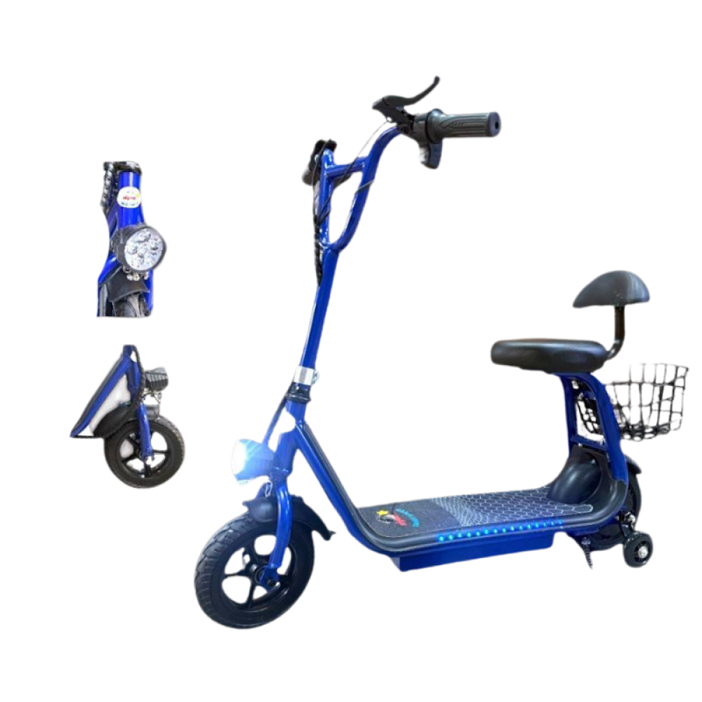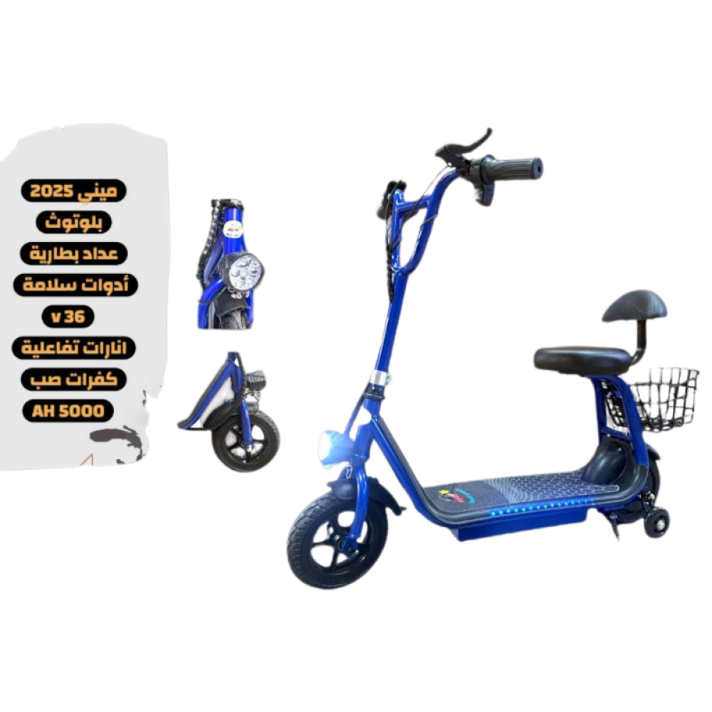 خلك مميز مع سكوتر كهربائي أنيق بلون أزرق لامع ، مجهز بمقعد مريح وسلة خلفية عملية لحمل أغراضك بكل سهولة .