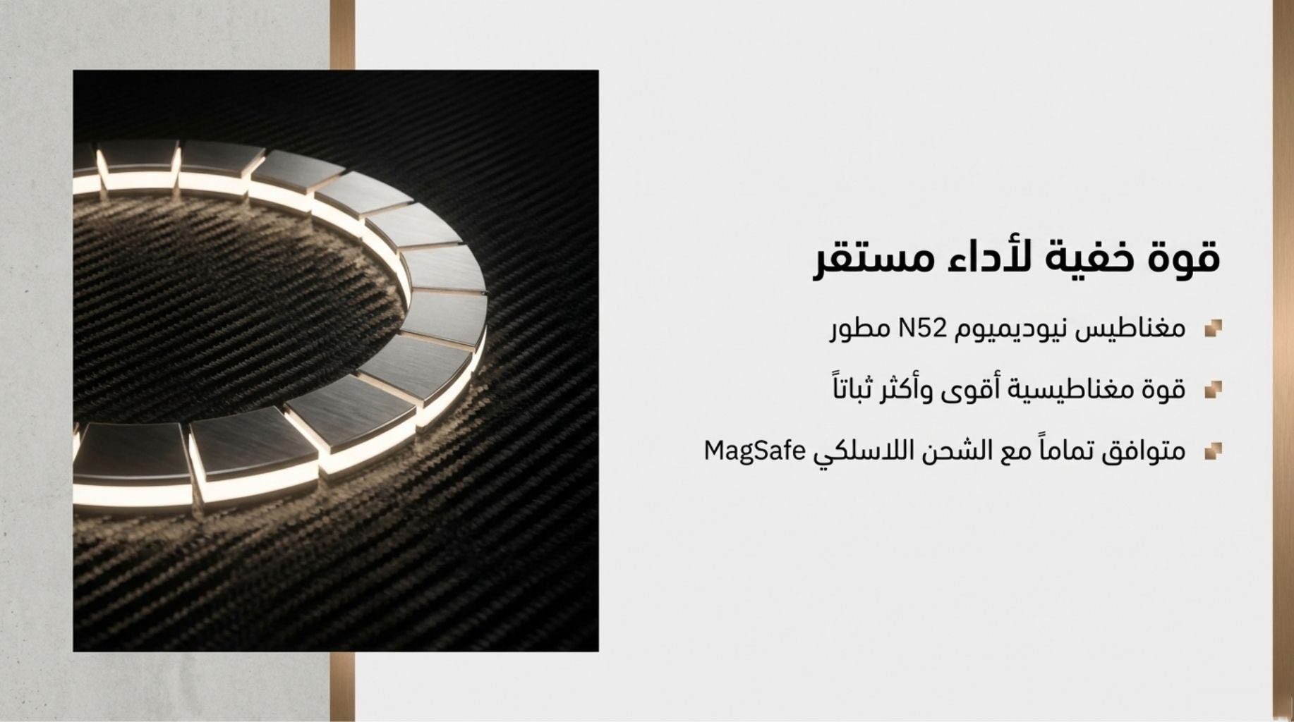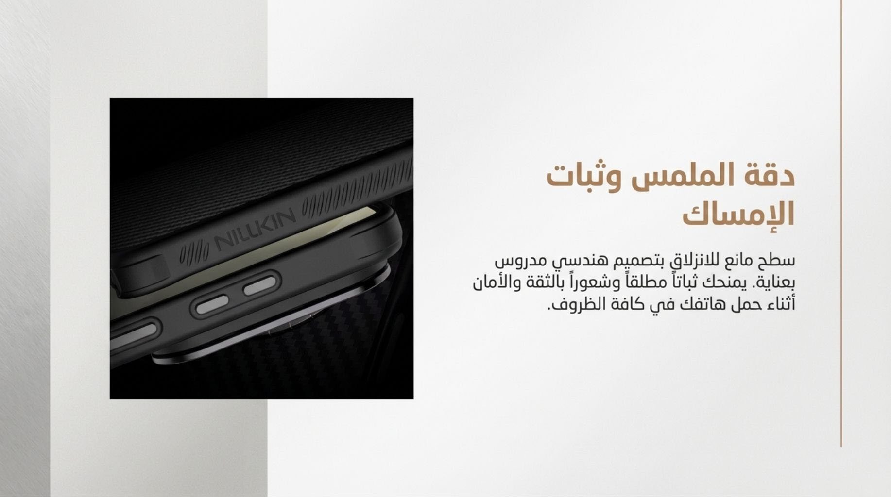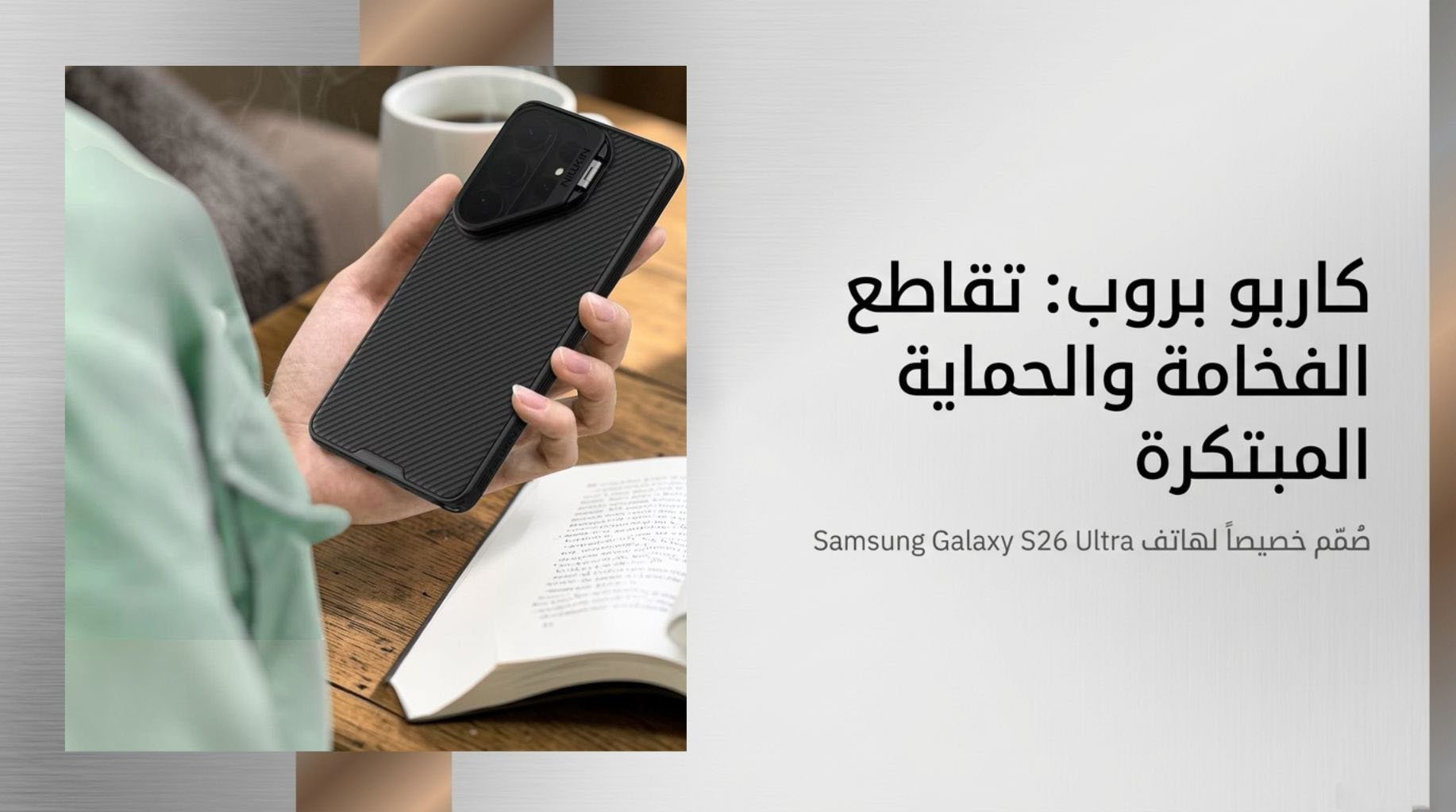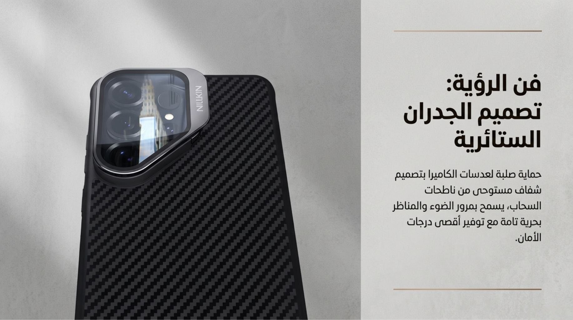 ملخص المواصفات - الماركة: نيلكين (Nillkin)- الموديل: كاربو بروب (CarboProp) - سلسلة CamProp- متوافق مع: Samsung Galaxy S26 Ultra- المادة الخلفية: ألياف الأراميد (Aramid Fiber)- إطار الكاميرا: ألمنيوم مصقول بتقنية CNC- غطاء الكاميرا: بولي كربونات أسود شفاف متحرك- محور المفصل: فولاذ كربون عالي SK7- المغناطيس: نيوديميوم N52 (متوافق مع MagSafe)- سطح مانع للانزلاق- غطاء الكاميرا ينغلق تلقائياً بقفل مسطح- تعديل زاوية بدون درجات- تم اختباره +20,000 مرة فتح وإغلاق- اللون: أسود